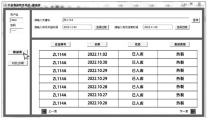 圖10 ZL114A熱裂測試Origin導出圖 進入導出的Origin界面圖,系統(tǒng)自動識別a、b、c三個特征點。 分析時間與溫度的關系:ZL114A液態(tài)合金澆注進入型腔后,熱電偶迅速測出實時溫度,因熱電偶一端位于型腔內部,所以溫度最高點a點實時溫度為616.5 ℃,低于實驗設定的澆注溫度720 ℃。此時砂型溫度仍為室溫,液態(tài)合金高溫遇冷,開始析出固相。 從b點(568.2 ℃)開始,出現(xiàn)b-c小平臺,由此推斷,合金正處于結晶晚期階段,釋放結晶潛熱會引起冷卻速度下降。合金從c點開始均勻冷卻,直到完全凝固。 分析時間與應力的關系:即凝固-應力曲線,該曲線能判斷合金凝固產(chǎn)生的應力大小及裂紋生成的時間,從而分析液態(tài)合金的熱裂行為。由曲線可以看出,合金慢慢析出固相,曲線處在載荷平臺上,說明合金有產(chǎn)生熱裂的傾向,隨著固相的增多,應力曲線出現(xiàn)上升趨勢,可以說明合金最終無熱裂紋產(chǎn)生。同時,利用所建立的鑄造性能數(shù)據(jù)庫,可查詢相同合金代號的合金,通過對比分析,對測試結果的評價和分析提供參考。 數(shù)據(jù)庫顯示界面如圖11所示,側欄顯示登錄的用戶名、“數(shù)據(jù)庫”及“對比分析”選項,數(shù)據(jù)庫實時更新。