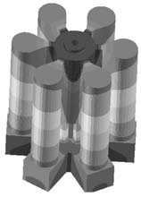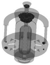 圖5 重力澆注工藝圖 重力澆注工藝模擬結(jié)果顯示,金屬液充型平穩(wěn),未見明顯紊流等異常現(xiàn)象,凝固順序較為理想,溫度場梯度均勻,實現(xiàn)自下而上凝固順序理念(圖6),疏松結(jié)果顯示鑄件部分未見明顯疏松區(qū)域(圖7),無孤立凝固相。分析認為,理論上工藝可行。方案工藝出品率約為55%。
