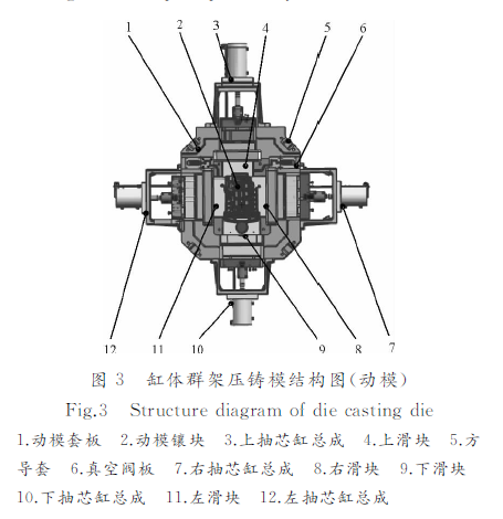 圖2 缸體群架U型澆道 模具結(jié)構(gòu)見(jiàn)圖3,由動(dòng)靜模鑲塊和4個(gè)滑塊及靜模斜抽芯組成,此模具屬于大型壓鑄模,為防止模具在生產(chǎn)過(guò)程中因熱膨脹影響正常的導(dǎo)向精度,采用方導(dǎo)柱、導(dǎo)套結(jié)構(gòu),布置在模具四角。滑塊抽芯采用液壓缸抽芯,模具設(shè)計(jì)簡(jiǎn)單、穩(wěn)定、可靠。