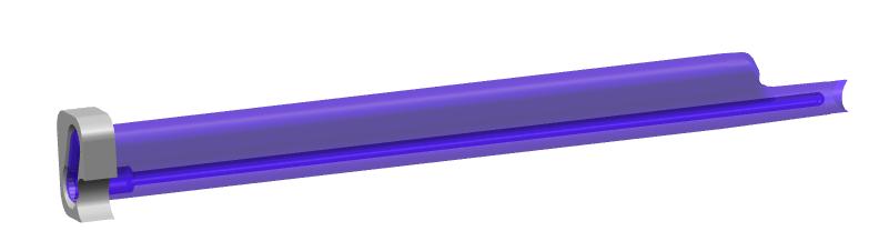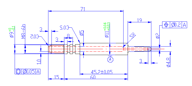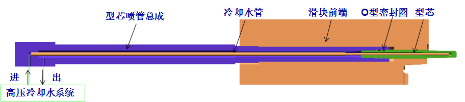 圖6 左滑塊異型鑲件 小細(xì)型芯加設(shè)冷卻水,對(duì)型芯進(jìn)行強(qiáng)制冷卻。型芯采用螺紋與后端的型芯噴管總成連接,采用耐高溫O型密封圈進(jìn)行密封,可以實(shí)現(xiàn)不拆模具進(jìn)行快速更換。型芯前端用電火花打孔機(jī)打直徑Φ2 mm的水道孔。型芯采用噴管式獨(dú)立水冷卻,內(nèi)置不銹鋼噴管Φ1.2 mm,內(nèi)孔進(jìn)水,外壁回水。結(jié)構(gòu)圖見(jiàn)圖7。