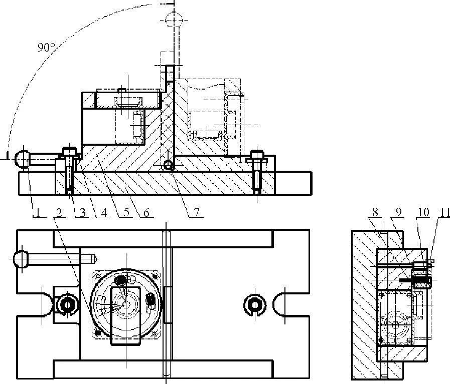 圖3 帶減速箱端蓋銑床夾具 為滿(mǎn)足與軸承和定子的裝配要求,需將所獲壓鑄件進(jìn)行必要的后續(xù)加工處理,以便兩處軸承室和止口尺寸車(chē)削或銑削至精度和形位公差達(dá)到要求,但由于端蓋形狀的特殊性,致使車(chē)削加工時(shí)即使有車(chē)夾具支持也無(wú)法實(shí)現(xiàn)一次裝夾完成兩個(gè)空間正交軸承孔的加工,因此,考慮采用銑夾具來(lái)解決上述問(wèn)題,見(jiàn)圖3。 夾具體5(見(jiàn)圖4)置于底座6之上,繞轉(zhuǎn)軸7在0°~90°之間翻轉(zhuǎn),并且0°和90°是兩個(gè)工作位置,手柄與夾具體插孔采用間隙配合以便完成插入翻轉(zhuǎn)后立即拔出(否則會(huì)妨礙銑削加工),同時(shí)夾具體5的一個(gè)固定槽剛好穿過(guò)底座上的夾具體鎖緊螺釘3,在固定槽和夾具體鎖緊螺釘3的頭部之間插入開(kāi)口墊片4,再擰緊螺釘3即限制了夾具體最后一個(gè)轉(zhuǎn)動(dòng)自由度。基于壓鑄件尺寸一致性程度高的特點(diǎn),端蓋鑄件在夾具體采用一面兩銷(xiāo)定位,即利用端蓋4-?5mm安裝孔中的2個(gè)對(duì)角孔分別套入一個(gè)定位圓銷(xiāo)2和一個(gè)菱形銷(xiāo)11。當(dāng)轉(zhuǎn)位壓塊10轉(zhuǎn)至指定位置時(shí)只需旋緊壓塊螺釘8即可鎖緊端蓋零件。