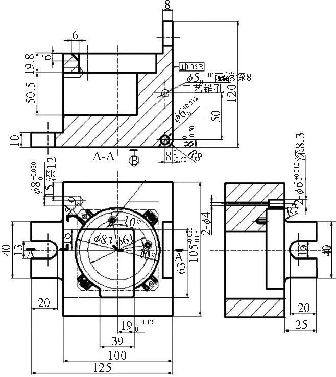 圖4 夾具體 結(jié)論 零件為壓鑄毛坯件且形狀不規(guī)則,所采用的一面兩銷(xiāo)定位和端蓋散熱槽轉(zhuǎn)位壓塊夾緊裝置是理想的選擇,巧妙地利用了壓鑄件尺寸一致性好的特點(diǎn),使低精度的IT10孔距安裝孔作為定位孔,防止了薄壁端蓋零件若強(qiáng)行采用三爪或平口鉗等通用夾緊方式所導(dǎo)致的零件變形。將夾具體5設(shè)計(jì)成可90°翻轉(zhuǎn)的活動(dòng)母體,輕松完成一次裝夾銑削相互空間正交的兩個(gè)軸承孔。選擇開(kāi)口墊片作為重要的夾緊原件,避免了必須將壓塊螺釘全部旋出。取夾具體5俯視圖轉(zhuǎn)軸孔右、下兩面交匯處的圓角為8mm,若小于其定位尺寸8mm,則夾具體翻轉(zhuǎn)時(shí)將會(huì)出現(xiàn)卡死現(xiàn)象。 端蓋零件難以在加工中心上用鋁塊毛坯完成銑削,壓鑄是較為合適的選擇,但壓鑄精度僅為IT10左右,為了將某些關(guān)鍵部位的尺寸精度提升一個(gè)數(shù)量級(jí),機(jī)床夾具的設(shè)計(jì)及其應(yīng)用尤為關(guān)鍵。