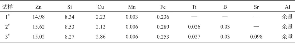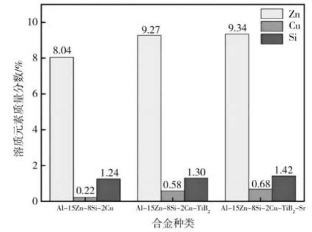 表2 合金α-Al晶粒尺寸定量統(tǒng)計 圖6b、d、f 右上方為對應(yīng)合金SEM局部放大圖,表3為不同位置的合金成分EDS能譜分析,根據(jù)能譜分析結(jié)合XRD結(jié)果可以得出,圖譜1對應(yīng)的塊狀相為Si相,圖譜2中對應(yīng)白色短棒第二相,該相為Al2Cu相,圖譜3為灰色長條狀第二相,該相為富Zn相。進(jìn)一步對三種合金成分下基體進(jìn)行掃描,掃描結(jié)果見圖7,發(fā)現(xiàn)三種合金成分下基體中Si、Zn、Cu元素含量有一定差異,復(fù)合添加TiC/TiB2納米顆粒和Al-10Sr中間合金后,基體中的溶質(zhì)元素含量進(jìn)一步提升,根據(jù)XRD圖譜可以得出,納米顆粒的添加使α-Al發(fā)生晶格畸變,促進(jìn)溶質(zhì)原子固溶到基體中,進(jìn)而加大了合金的固溶強化作用。