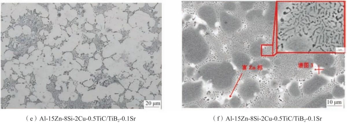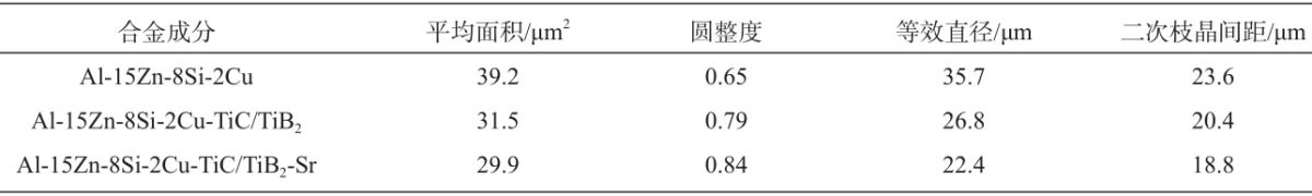 式中:d為晶面間距;a為晶格常數(shù);h、k、l為晶面指數(shù)。合金試樣的衍射峰都向右移動,則2θ角變大,而晶面間距d與θ成反比,由公式(2)可知d與晶格常數(shù)a成正比,d減小,則Al的晶格常數(shù)a也減小,說明添加納米顆粒后,晶粒發(fā)生細(xì)化,促進(jìn)Si原子固溶進(jìn)入Al基體中,Al在成形時發(fā)生了晶格畸變,而鋁的原子半徑rAl=0.143 nm大于硅的原子半徑rSi=0.117 nm,所以導(dǎo)致Al的晶格常數(shù)a減小。同時也可以觀察到,Al-15Zn-8Si-2Cu-TiC/TiB2和Al-15Zn-8Si-2Cu-TiC/TiB2-Sr試樣所對應(yīng)的XRD曲線中富Zn相及Al2Cu相所對應(yīng)的衍射峰,相對于Al-15Zn-8Si-2Cu試樣所對應(yīng)的衍射峰強度顯著增加,進(jìn)一步說明納米顆粒的添加會導(dǎo)致Al基體發(fā)生晶格畸變,進(jìn)一步促進(jìn)溶質(zhì)原子固溶到基體中,起到固溶強化的作用。 圖6為納米顆粒細(xì)化劑及變質(zhì)劑添加前后Al-15Zn-8Si-2Cu合金的顯微組織,圖6a、c和e是光學(xué)顯微組織圖,圖6b、d和f是掃描電鏡組織圖,從光學(xué)顯微組織中可以觀察到合金主要由α-Al枝晶和共晶Si相組成,未添加細(xì)化劑和變質(zhì)劑合金組織中存在較為粗大的α-Al枝晶和板條狀的共晶Si相,在掃描電鏡組織中可以觀察到圓點狀和短棒的第二相分布在晶界處,如圖6a和b所示。添加TiC/TiB2納米顆粒后,基體組織中α-Al枝晶尺寸顯著減小,且合金組織更為致密,如圖6c、d所示。添加Al-10Sr中間合金變質(zhì)處理后,共晶Si相發(fā)生明顯的鈍化,由板條狀轉(zhuǎn)變?yōu)槎贪魻睿瑢w的割裂作用降低,此時α-Al呈近等軸狀,如圖6e、f所示,此時達(dá)到最優(yōu)力學(xué)性能。為了進(jìn)一步探究合金的細(xì)化變質(zhì)效果,采用了Image Pro軟件對合金的晶粒尺寸進(jìn)行了分析,分析測試結(jié)果如表2所示,從表中可以看出,合金經(jīng)過細(xì)化處理后,晶粒的平均尺寸明顯減小,圓整度大幅提高。此時α-Al晶粒的平均面積為31.5 μ㎡,圓整度達(dá)到0.79,等效直徑為26.8 μm,二次枝晶間距為26.8 μm。進(jìn)一步經(jīng)變質(zhì)處理后,合金的晶粒尺寸變化幅度較小,等效直徑為22.4 μm,圓整度得到小幅度的提升達(dá)到0.84。