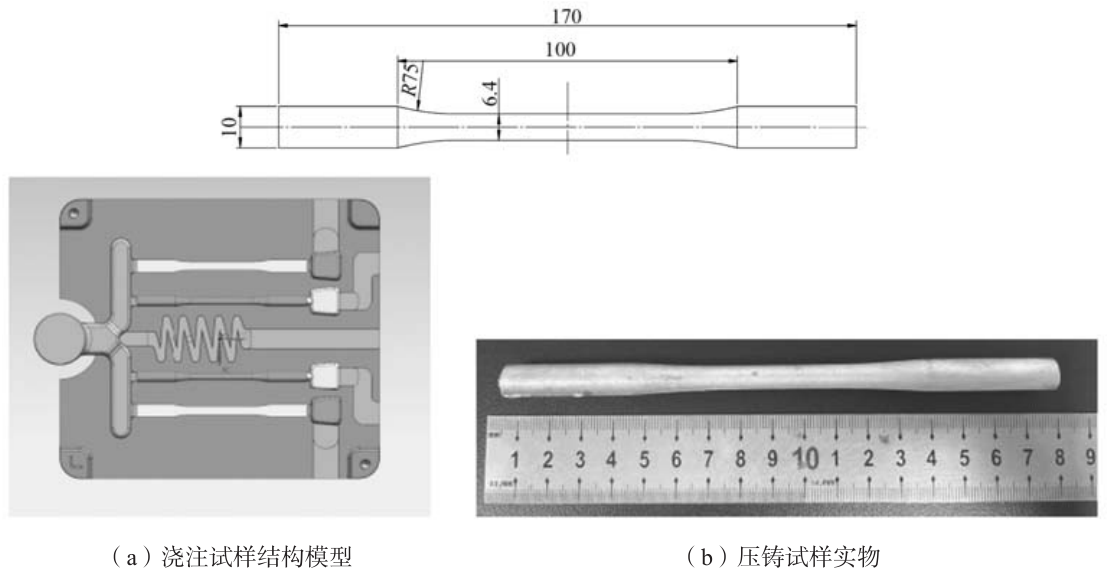 表1 試驗合金成分 wB/% 熔煉過程首先將純鋁錠和鋁硅中間合金放入熔煉爐中,將熔煉爐加熱至760 ℃,待爐內(nèi)合金完全熔化后,加入Al-50Cu中間合金和純Zn錠。待完全熔化后加入0.1%Al-10Sr中間合金,然后加入0.5%的TiC/TiB2陶瓷納米顆粒,采用FB900型超聲振動器,超聲波振動工藝參數(shù)設(shè)定功率為3 kW,頻率為20 kHz,超聲處理5 min。處理完成后靜置,準(zhǔn)備壓鑄。壓鑄試驗采用280 t立LK IMPRESS-III 壓鑄機,鋁液澆注溫度為680~700 ℃,壓射低速0.10~0.15 m/s,高速3.5~5.5 m/s,試驗所選取的比壓為200 MPa,保壓時間為30 s,模具溫度為200 ℃。 試驗完成后,采用HD-B615A-S電腦伺服雙柱拉力材料試驗機進(jìn)行拉伸測試,拉伸試棒尺寸如圖1所示。金相試樣由拉伸試棒尾部截取約20 mm段,經(jīng)過打磨拋光后使用凱勒溶液進(jìn)行腐蝕,用OLYMPUS GX-51型光學(xué)顯微鏡觀察試樣組織,采用Verios G4 UC 型掃描電鏡對壓鑄件組織的第二相形貌和溶質(zhì)元素分布等信息進(jìn)行分析,溶質(zhì)元素分析在試樣中心晶粒內(nèi)部取點,每個試樣采五點,取平均值。借助XRD分析合金的相組成,采用HD-B615A-S電腦伺服雙柱拉力材料試驗機對合金力學(xué)性能測試,澆注系統(tǒng)如圖1所示。將試樣表面磨拋至光潔,采用 FIRST FD-102渦流電導(dǎo)儀進(jìn)行電導(dǎo)率測試。