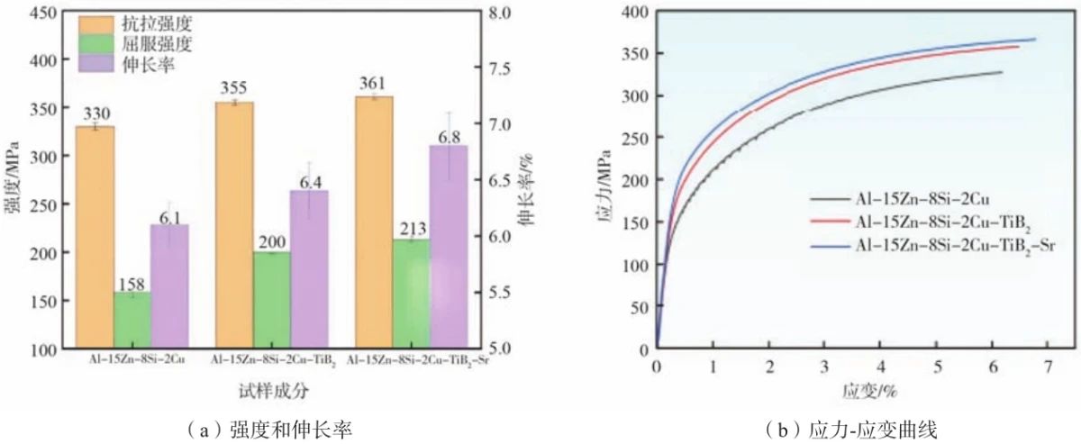 圖2 添加細(xì)化劑變質(zhì)劑前后Al-Zn-Si-Cu合金的力學(xué)性能