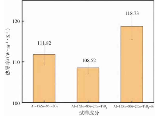 圖3 添加細(xì)化劑和變質(zhì)劑前后Al-Zn-Si-Cu合金的斷口形貌 2.2 細(xì)化變質(zhì)處理對合金熱導(dǎo)率的影響 圖4為納米顆粒細(xì)化劑及變質(zhì)劑添加前后Al-15Zn-8Si-2Cu合金的熱導(dǎo)率,根據(jù)測試結(jié)果顯示,在未添加納米顆粒細(xì)化劑及變質(zhì)劑前,合金的熱導(dǎo)率可達(dá)到111.82 W·(m·K)-¹,添加納米顆粒細(xì)化劑及變質(zhì)劑后,合金熱導(dǎo)率呈小幅度下降,添加Al-10Sr變質(zhì)劑后,合金的熱導(dǎo)率發(fā)生上升,達(dá)到118.73 W·(m·K)-¹。