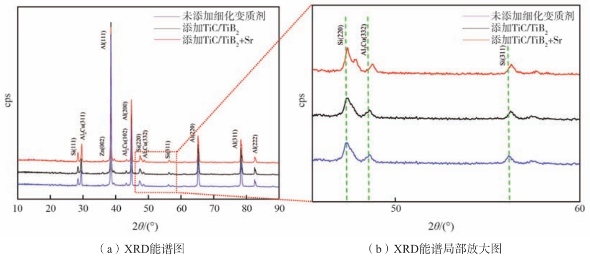 圖5為納米顆粒細(xì)化劑及變質(zhì)劑添加前后Al-15Zn-8Si-2Cu合金的XRD能譜,根據(jù)PDF卡片分析,得出本試驗合金成分主要有Al、Si、富Zn相及Al2Cu相等4種物相組成,從圖中可以看出隨著納米顆粒TiC/TiB2的添加,合金金試樣中Si(111)、Al(111)、Al2Cu(311)及Zn(002)等衍射峰所對應(yīng)的衍射峰向右發(fā)生了偏移,根據(jù)X射線衍射基本理論,可以用布拉格公式說明峰對應(yīng)的衍射角度以及和相應(yīng)的晶面間距之間的關(guān)系,公式: