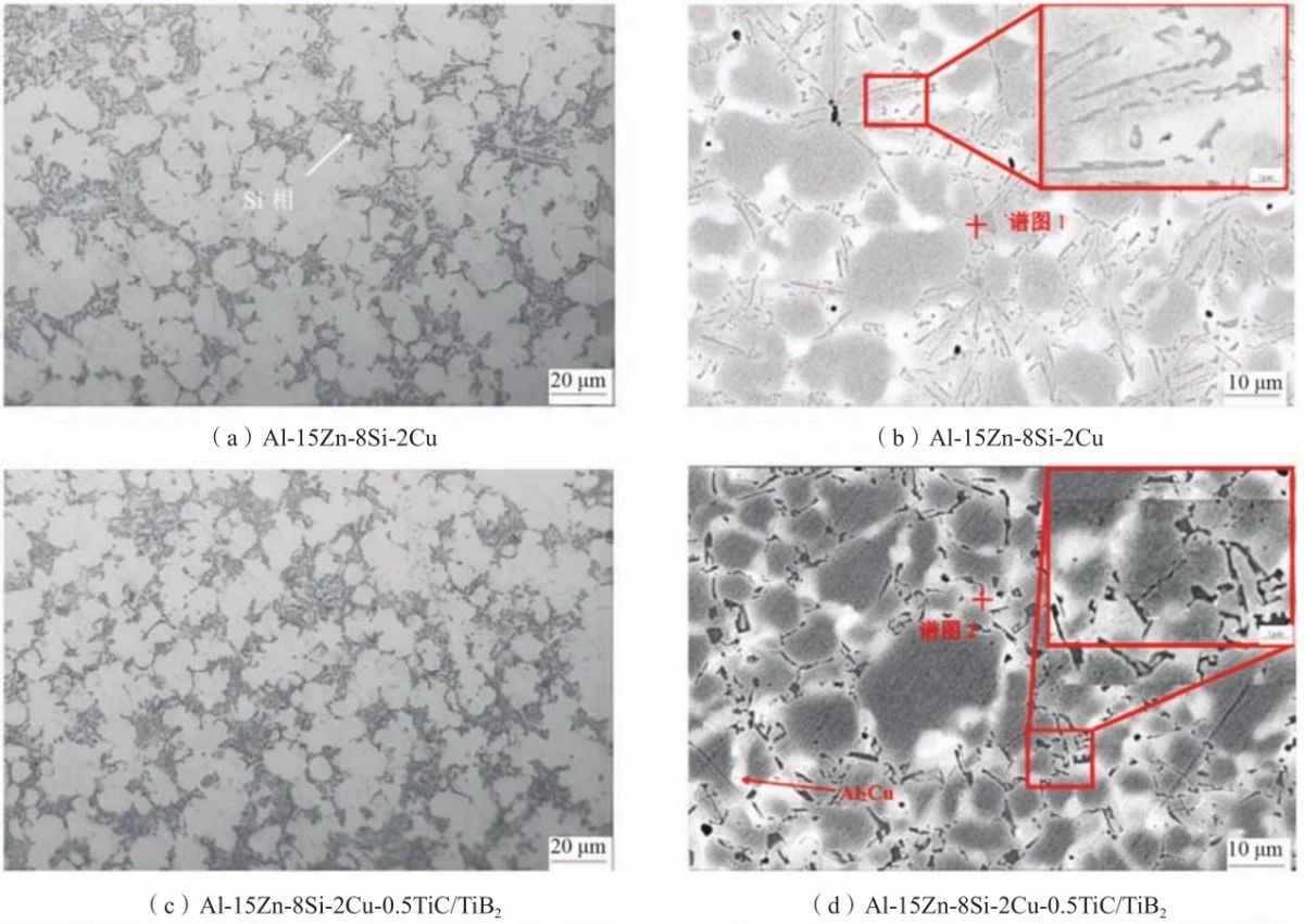 圖6 添加細(xì)化劑和變質(zhì)劑前后Al-Zn-Si-Cu合金的顯微組織