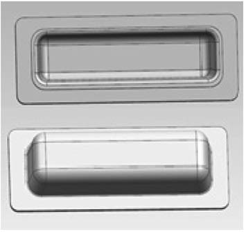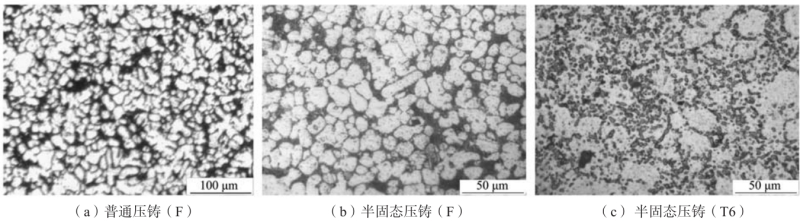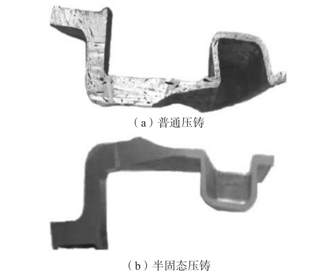 圖7 五段速度射出模式B壓射過程的模擬結(jié)果 3 生產(chǎn)驗證 根據(jù)五段速度射出模式B的壓射工藝曲線,應(yīng)用勻加速料筒孕育半固態(tài)流變壓鑄工藝進(jìn)行扣手鑄件的實際生產(chǎn)試驗,并同單段低速射出模式的普通壓鑄產(chǎn)品進(jìn)行了比較分析。鋁合金液澆注溫度為640 ℃,壓射沖頭的最高低速速度為0.7 m/s、高速速度為2 m/s,模具預(yù)熱溫度為200 ℃。采用該壓鑄工藝獲得了外形輪廓清晰、表面光滑、尺寸精度高、無缺陷的扣手壓鑄件,如圖8所示。通過對壓鑄件進(jìn)行解剖分析可以看到,采用普通壓鑄工藝的鑄件剖面存在大量的氣孔缺陷,如圖9a所示;而半固態(tài)壓鑄件的剖面沒有發(fā)現(xiàn)氣孔,如圖9b所示,另外通過對鑄件整體的X光透射探傷表明,扣手鑄件內(nèi)部無明顯縮松、縮孔、氣孔和氧化夾雜等缺陷。圖10為扣手鑄件的鑄態(tài)和T6的微觀組織。從圖中可以看出,初生α-Al相呈近球狀,晶粒細(xì)小,分布均勻,具有較明顯的半固態(tài)組織特征。另外還對鑄件進(jìn)行了T6處理和焊接試驗,經(jīng)過535 ℃、8 h的固溶處理后,可以明顯看到,普通壓鑄件表面存在較多的鼓泡現(xiàn)象,而半固態(tài)鑄件表面沒有發(fā)現(xiàn),如圖11所示;同樣,在焊接后普通壓鑄件的焊縫附近存在鼓泡現(xiàn)象,而半固態(tài)鑄件不存在,如圖12所示。由此可見,采用勻加速料筒孕育半固態(tài)流變壓鑄工藝進(jìn)行壓鑄件的生產(chǎn),可以有效消除普通壓鑄件的內(nèi)部氣孔問題,實現(xiàn)了壓鑄件的T6熱處理和焊接加工。