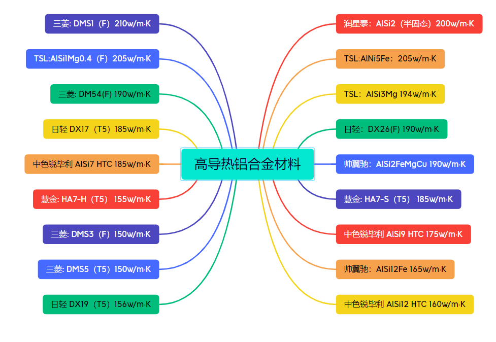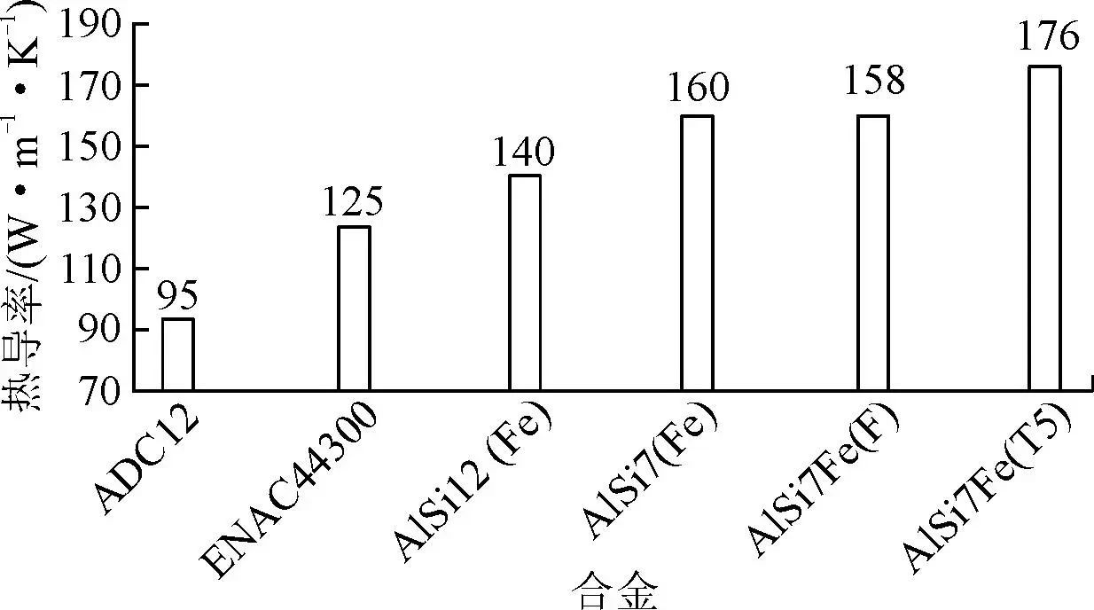 圖3 導熱壓鑄鋁合金代表零件 導熱領域適用鋁合金材料見表4,和ADC12合金相比,為了保證熱導率,要去除雜質合金元素,特別是對熱導率影響比較大的元素,如Ti、Mn、Zr、Mg等,各元素對熱導率的影響見圖4。另外,T5熱處理(200~350℃)可以消除壓鑄過程中產生的內應力,提高材料的熱導率(見圖5)。圖6為高導熱壓鑄鋁合金材料統計。可以看出,合金元素含量越低,熱導率越高,為了獲得200W/(m·K)左右的熱導率,Si的含量通常在2%左右,或者使用Ni元素作為主要合金元素,或者用半固態工藝。