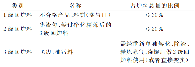 表4 回爐料分級管控參照表 鋁合金在壓鑄生產過程中, 由于需要對壓射沖頭進行潤滑, 潤滑介質為沖頭潤滑油或者潤滑顆粒。壓鑄完成后, 大部分的沖頭潤滑殘留物積聚在料餅表面, 形成夾雜物。在回爐料中有一部分是加工后的廢品, 其表面含有切屑液及油污的殘留成分, 熔化過程中, 殘留的切屑液和油污經過高溫加熱, 產生大量的煙氣、水氣, 加速了Al液的吸氣以及氧化夾雜產生。為保證Al液品質, 建議回爐料占比見表4。根據以上試驗數據分析, 回爐料不僅導致Al液中夾雜物增多以及化學成分變化, 而且由于夾雜物增多, 也會影響鑄件的力學性能;在壓鑄充填過程中還會影響Al液的流動性, 導致諸多壓鑄缺陷產生。所以在日常熔化過程中, 既要考慮到熔煉成本, 又要保證Al液的質量, 根據產品需求必須對回爐料進行分級并合理按所需比例使用。