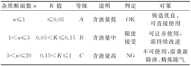 表5 K值標準對照表 試樣在半凝固狀態下放入密閉的空間, 然后對其進行抽真空, 待試樣在真空容器內完全凝固, 得到的試樣通過觀察外觀, 對比標樣得出Al液中的含氫量。試驗時, 取少量Al液倒入經預熱的坩堝內, 立即 (小于10s) 放入密封的真空室內, 然后打開測氫儀真空泵, 真空室形成真空狀態。