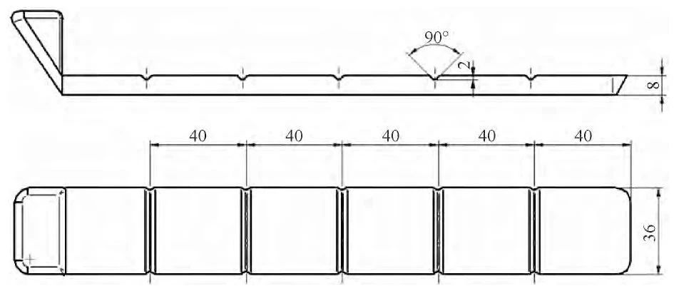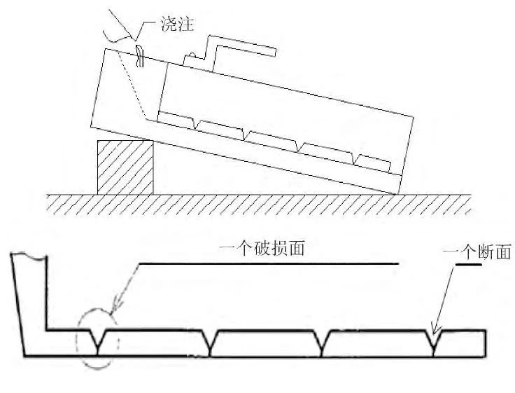圖5 K模尺寸示例圖 (1) K模模具準備K模清潔1次/班, 并均勻噴涂模劑涂料打底;K模預熱30~60min;其底面與地面末端夾角為30°~45°, 方便Al液導入、氣體排出。(2) K模尺寸 (見圖5) 及試樣澆注:①用勺子舀Al液, 勺子倒入K模時不得澆注過快以免堵塞澆料口, 導致K模內氣體無法從澆料口排出, 保持勻速直至澆滿; ②待冷卻8~10s將K模試樣取出, 按照此方式連續澆注5模試樣; ③K模澆注前:Al液必須經過旋轉除氣機除渣除氣完成后進行, 澆包內浮渣清理干凈; ④等待K模試樣自然冷卻或者水冷后擦干試樣表面殘留水分, 將每根K模試樣按照折斷線位置均勻敲成4小段, 并整齊碼放一起, 共計5組。