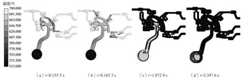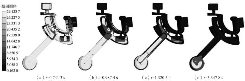 圖5 方案二充型過(guò)程模擬結(jié)果 兩種澆注方式充填過(guò)程都有一定程度的飛濺,但方案一飛濺區(qū)域?yàn)榻畎鍌?cè)壁,而方案二飛濺區(qū)域?yàn)殍T件弧面外觀面,可能會(huì)導(dǎo)致鑄件弧面出現(xiàn)毛刺。從技術(shù)要求免加工的角度來(lái)看,方案一更為合理。 3.2 凝固過(guò)程分析 方案一的凝固過(guò)程如圖6所示,金屬液最先在鑄件邊緣開始凝固,之后自邊緣處向澆道方向凝固。當(dāng)t=1.528 3 s時(shí),內(nèi)澆道開始凝固,鑄件主體基本凝固,但部分壁厚區(qū)尚未完全凝固。從整個(gè)凝固過(guò)程來(lái)看,凝固時(shí)部分區(qū)域并未按序凝固,套筒連接區(qū)的筋板壁及內(nèi)壁先凝固,而上下平面為壁厚區(qū),后凝固,因此該區(qū)域易形成縮松、縮孔。方案二的凝固過(guò)程如圖7所示。相比與方案一,其內(nèi)澆道凝固時(shí)間更長(zhǎng),但其套筒連接區(qū)問(wèn)題與方案一一致,且筋板與內(nèi)壁交叉連接處,筋板壁和內(nèi)壁先凝固且無(wú)內(nèi)澆道與之對(duì)應(yīng),因此這些區(qū)域會(huì)出現(xiàn)孤立液相區(qū),從而鑄件在這些區(qū)域出現(xiàn)縮松、縮孔的現(xiàn)象。