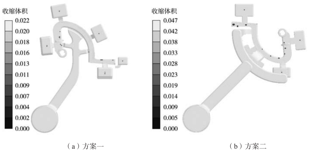圖7 方案二凝固過(guò)程模擬結(jié)果 3.3 缺陷分析 圖8為兩種方案的縮松縮孔分布圖。鑄件缺陷集中于套筒連接平臺(tái)區(qū)、部分筋板交叉區(qū)和通孔板件區(qū)上下表面這些壁厚區(qū)域,主要由于這些區(qū)域壁厚較其他部位要厚,凝固時(shí)這些區(qū)域溫度較周圍壁薄處要高,因此金屬液凝固緩慢,與周圍壁薄區(qū)域產(chǎn)生間隙,在完全凝固時(shí)得不到金屬液的補(bǔ)充,從而出現(xiàn)縮松、縮孔的缺陷。對(duì)比兩種方案,出現(xiàn)缺陷的位置大致相同,但方案二未在筋板交叉處設(shè)置對(duì)應(yīng)內(nèi)澆道,故筋板交叉區(qū)缺陷較方案一要多。在去除溢流槽后,方案一的縮松、縮孔體積為0.056 cm³,而方案二的縮松、縮孔體積為0.083 cm³,因此,在減少縮松、縮孔方案,方案一更優(yōu)。