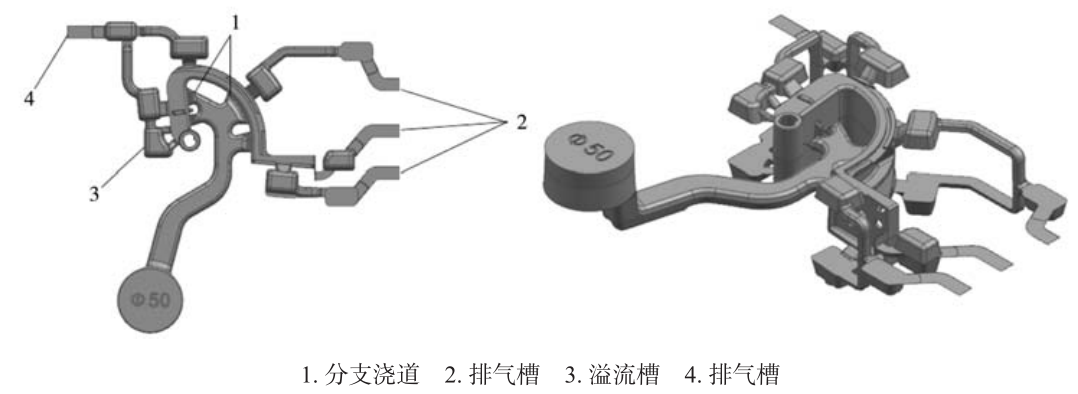 圖8 縮松、縮孔分布圖 綜合比較兩種工藝方案,方案二在余料去除工作方面較為簡(jiǎn)便,但在縮松、縮孔方面,方案一產(chǎn)生的缺陷更少;方案二在開模時(shí)較為繁瑣,除沿分型面上下開模外還需沿分支澆道切線方向開模,生產(chǎn)工序復(fù)雜。因此選用方案一作為后續(xù)工藝改進(jìn)方案。 4 工藝改進(jìn) 4.1 優(yōu)化方案 除了初始工藝充填存在的問(wèn)題外,原方案的主澆道截面積過(guò)大,對(duì)于鑄件后續(xù)加工余量去除工作較為繁瑣,因此對(duì)澆排系統(tǒng)做出調(diào)整。針對(duì)套筒連接平面過(guò)厚且內(nèi)澆道距離過(guò)遠(yuǎn)無(wú)法做到有效補(bǔ)縮的問(wèn)題,增加冷卻系統(tǒng)予以優(yōu)化。 在充填過(guò)程中,增加橫澆道拐角,減少液流自直澆道進(jìn)入橫澆道時(shí)產(chǎn)生的紊流以及進(jìn)一步對(duì)充填壓力予以補(bǔ)縮;將主澆道取消,改為左右兩側(cè)各增加一個(gè)分支澆道,使得兩側(cè)澆道金屬液盡量在弧頂?shù)囊缌鞑厶巺R流。在套筒切向連接平臺(tái)區(qū)布置溢流槽,方便金屬液在套筒壁匯流前將夾渣和氣體排除,減小液流在匯流處的沖擊強(qiáng)度,避免在套筒壁處出現(xiàn)冷隔。同時(shí)設(shè)置排氣槽,將上下對(duì)應(yīng)的溢流槽以排氣槽予以連接,方便氣體排除,杜絕鑄件內(nèi)部氣孔的存在。澆排系統(tǒng)優(yōu)化如圖9。
