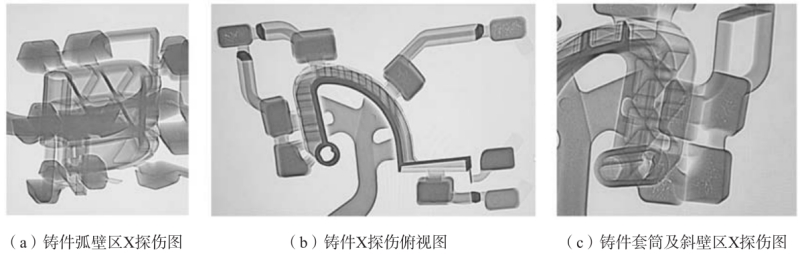 圖14 X射線探傷檢測(cè)圖 5 結(jié)論 (1)根據(jù)鉸鏈支架結(jié)構(gòu)結(jié)合技術(shù)要求,設(shè)計(jì)了兩種壓鑄工藝。通過(guò)CAE軟件,對(duì)充型凝固過(guò)程進(jìn)行模擬仿真分析,對(duì)比選出一種可供進(jìn)一步優(yōu)化的方案。 (2)通過(guò)改進(jìn)澆排系統(tǒng)和增加冷卻水路,解決了鉸鏈支架鑄件縮松、縮孔和冷隔的缺陷,滿足技術(shù)要求,為該類零件生產(chǎn)提供有效的工藝生產(chǎn)模板。 作者: