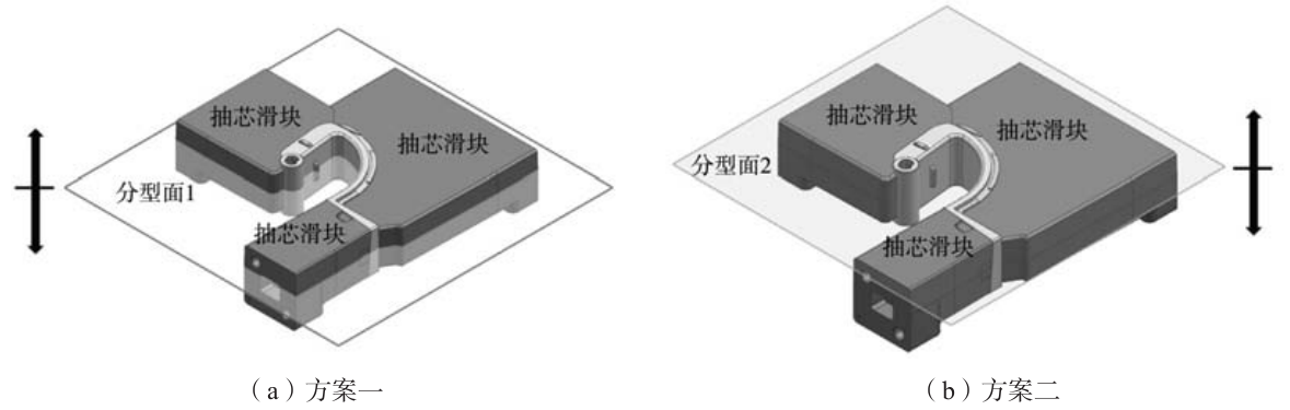 圖2 分型面方案示意圖 2.2 澆注系統(tǒng)設(shè)計(jì) 設(shè)計(jì)了兩種澆注系統(tǒng),三維結(jié)構(gòu)示意圖見圖3。