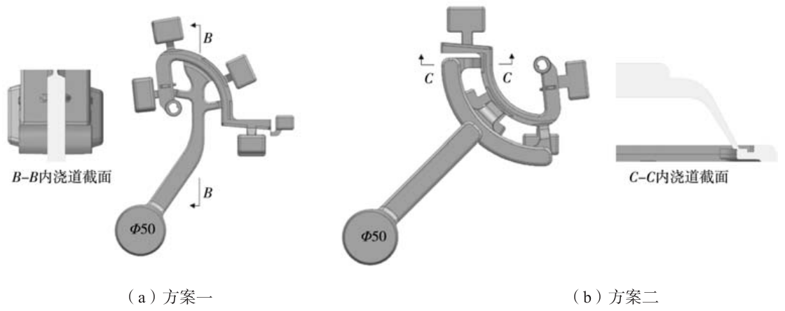 圖3 澆注系統(tǒng)結(jié)構(gòu)示意圖 2.2.1 內(nèi)澆道設(shè)計(jì) 在圖3的方案1中,為避免澆道與型芯直接接觸,將內(nèi)澆道布置在內(nèi)壁;為縮短澆注流程將內(nèi)澆道布置于筋板交叉對(duì)應(yīng)內(nèi)壁處,澆注液體沿筋板充填,大大縮短充填時(shí)間;考慮到金屬液流至型腔的各部位距離盡量相等,采用一大兩小的內(nèi)澆道分布方式。在圖3的方案二中,為避免金屬液直接正面沖擊型芯,將進(jìn)澆方式改為斜進(jìn)澆,以及考慮到金屬液流至型腔的行程相當(dāng),布置分進(jìn)澆道。內(nèi)澆道截面積計(jì)算如下。