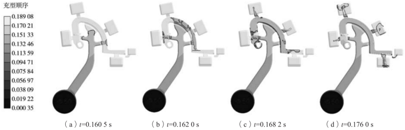 表2 鑄造工藝參數(shù) 3.1 充型過(guò)程分析 方案一的充型過(guò)程如圖4所示。金屬液首先進(jìn)入直澆道,在t=0.160 5 s時(shí)通過(guò)弧面分支澆道后,噴射至筋板底部并沿筋板壁回流至弧面壁;在t=0.162 0 s時(shí),金屬液通過(guò)主澆道及左側(cè)分支澆道,噴射至筋板交叉處底部并沿筋板分散充填;在t=0.168 2 s時(shí),弧頂處充填完成后,左側(cè)金屬液沿上下平面及筋板向鑄件套筒方向充填;在t=0.176 0 s時(shí),金屬液充填完畢,型腔基本被完全充填,無(wú)充填空缺。從整個(gè)充填過(guò)程看,金屬液流動(dòng)過(guò)程基本平穩(wěn),存在一定程度的飛濺,但飛濺區(qū)域?yàn)榻畎鍏^(qū),鑄件外觀面不受影響;主澆道與左側(cè)分支澆道金屬液在左側(cè)分支澆道右側(cè)內(nèi)壁匯流,充填產(chǎn)生的夾渣無(wú)法通過(guò)溢流槽有效排除;金屬液在套筒連接區(qū)內(nèi)壁處有匯流,可能會(huì)出現(xiàn)卷氣、冷隔、縮孔、縮松等缺陷;溢流槽數(shù)量和位置存在不合理的地方,未在上下面套筒區(qū)域布置溢流槽。