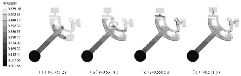 圖4 方案一充型過(guò)程模擬結(jié)果 方案二的充型過(guò)程如圖5所示。金屬液由直澆道進(jìn)入橫澆道,在t=0.451 2 s時(shí),通過(guò)主內(nèi)澆道進(jìn)入鑄件型腔,沖擊弧面壁后液流沿弧面壁上下流動(dòng);在t=0.531 8 s時(shí),金屬液通過(guò)兩分支澆道進(jìn)入鑄件型腔,主澆道處金屬液在其澆道左側(cè)受型芯阻礙流動(dòng)緩慢,如圖5圈中所示,這可能導(dǎo)致渦流和卷氣的產(chǎn)生。在t=0.550 5 s時(shí),鑄件弧面區(qū)域充填完成,金屬液向鑄件兩側(cè)末端充填。在t=0.551 8 s時(shí),金屬液充填完畢,型腔被完全充填,無(wú)充填空缺。從整個(gè)充填過(guò)程看,方案二受型芯阻礙影響先充填套筒連接區(qū)域,且充填過(guò)程存在一定程度飛濺,飛濺影響區(qū)為鑄件外觀面;金屬液流動(dòng)受弧面筋板影響,部分區(qū)域存在卷氣和渦流;金屬液在鑄件外觀面匯流,且對(duì)應(yīng)區(qū)域無(wú)法設(shè)置溢流槽。
