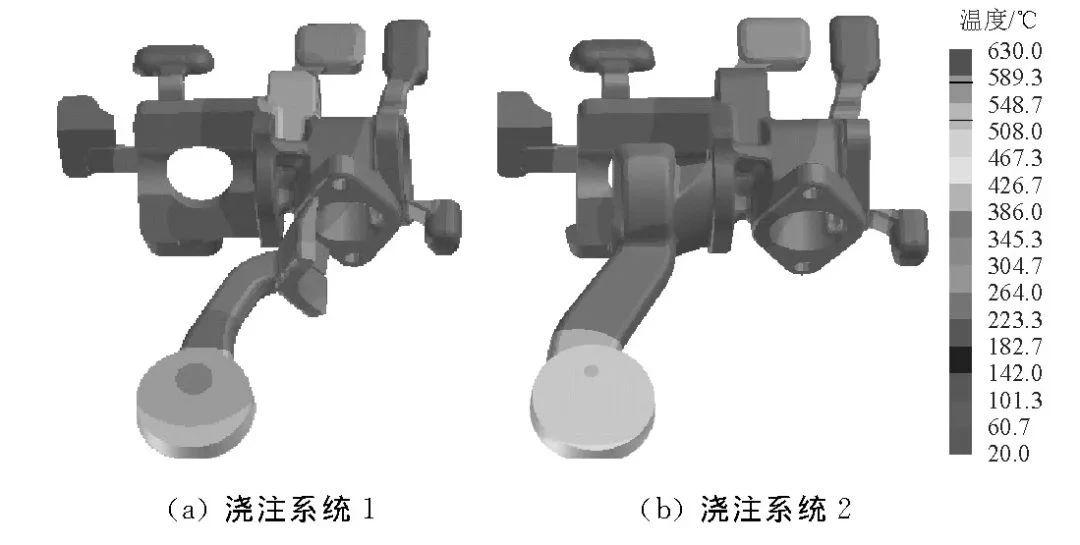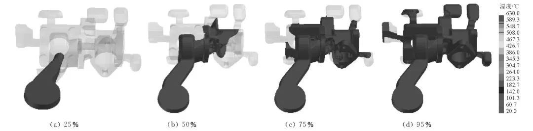 圖7 鑄件凝固后的溫度場 澆注系統1縮孔缺陷預測結果見圖8。由圖8可知,鑄件在壁厚區域的地方產生了縮孔缺陷,鑄件產生的縮孔體積為0.46cm3(去除溢流槽),切面處縮孔率為80%~90%,可以看出,澆注系統2也在鑄件厚壁區域產生縮孔缺陷,其產生的縮孔體積為0.16 cm3,切面處的縮孔率為80%~85%,比澆注系統1產生縮孔缺陷少,其主要原因是金屬液在澆注系統1條件下開始充填厚壁區域的時間較早,在凝固時厚壁區域溫度高,凝固速率慢,更易產生孤立液相,產生縮孔缺陷,因此澆注系統2更優。