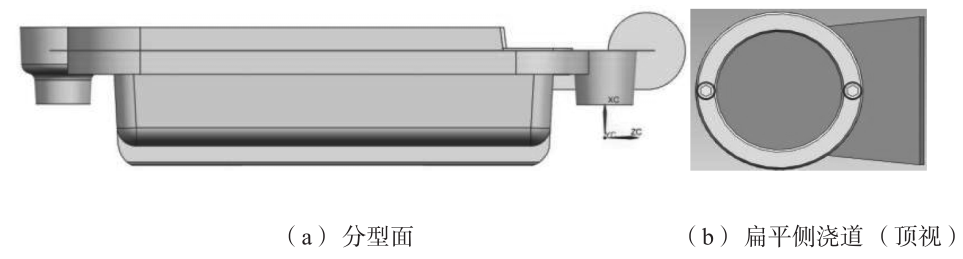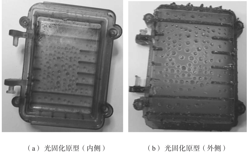 圖8 光固化快速成形方法打印的模型 3 壓鑄模具設計 3.1 鑄件壓鑄工藝分析 信號放大器外殼材料采用YL112,尺寸為150 mm×差范圍±0.3 mm)。零件整體上為較規則的長方形槽殼體,外置凸出螺紋孔(后期加工)和安裝轉軸,設有散熱薄片和邊沿安放密封膠的凹槽。結合該零件特征并根據分型面選擇原則,確定如圖 9a所示分型面。由于零件外表面含有較多豎直散熱薄片,不宜選擇中心澆注,故選擇扁平側澆口,見圖 9b。