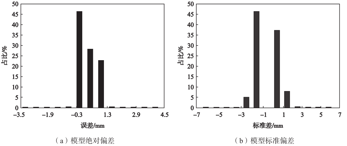 圖6 逆向模型與點云數據對比 需要在此指出,本研究中激光掃描所得點云與逆向模型的誤差主要集中于零件內側邊沿附近的密封槽處(圖6a),這主要是由于激光掃描前噴涂了顯像劑,而逆向建模時考慮到了“零件設計意圖”并對局部尺寸進行了圓整所致。雖然對模型尺寸進行圓整與再設計會導致模型與點云較大的局部誤差,但這也正體現了逆向工程中理解零件的設計意圖(“靈魂”)重于設計尺寸(“軀殼”)的本質。 逆向模型與點云的絕對偏差與標準偏差分布見圖7。結合Geomagic詳細分析文件可知,絕對偏差值在-0.75~+0.75 mm范圍內的點數占比97.55%,而根據圖7b測量點標準偏差的正態分布結果,在3個標準偏差內的點數占比高達98.74%,可見逆向模型與激光掃描點云高度貼合。