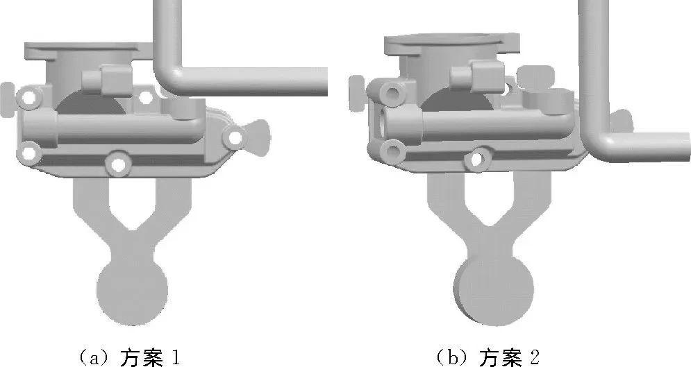 圖5 初始方案縮孔、縮松分布 為了優化鑄件的凝固溫度場, 避免A處出現縮孔、縮松缺陷, 需要采取局部加快冷卻速度的方法。由于A處的壁厚相較于周邊壁厚大很多, 因此優化方案擬采用強制水冷的方式來加快冷卻速度。分析鑄件和模具結構, 在靠近部位A處設計了兩種優化方案, 見圖6。其冷卻水管直徑均為φ20mm。優化方案模擬時循環冷卻水溫度設置為30℃, 水和模具之間的表面傳熱系數設置為5 000W/ (㎡·K) 。
