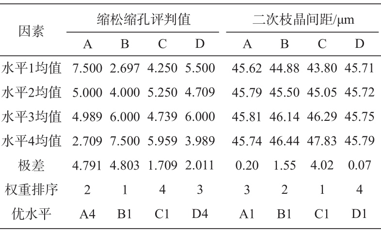 表4 正交試驗結果 2.3 工藝參數對評價指標的影響 為了揭示各因素對評價指標的影響規律,并確定各因素的優水平,基于正交試驗的結果,進行均值和極差分析,結果如表5所示。 根據表5均值與極差分析的結果,縮松縮孔評判值隨著澆注時間的增加而減小,隨著澆注溫度的升高而增大,而隨著模具預熱溫度和冷卻水溫度的變化呈現出波動變化,各因素對縮松縮孔缺陷的影響權重排序為:澆注溫度>澆注時間>冷卻水溫度>模具預熱溫度。二次枝晶間距隨著澆注時間的增加而先增大后減小,隨著澆注溫度和模具預熱溫度以及冷卻水溫度的升高而增大,各因素對二次枝晶間距影響權重的排序為模具預熱溫度>澆注溫度>澆注時間>冷卻水溫度。