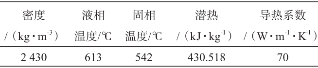 圖1 澆注系統三維模型 1.2 材料及工藝參數設置 制動鉗材料為A356鋁合金,其熱物性參數如表1所示。模具采用H13鋼。制動鉗壁厚不均勻,采用金屬型重力鑄造成形時,為避免鉗體薄壁部分過早凝固而使后續難以補縮,造成冷隔和澆不足等鑄造缺陷,應適當提高澆注溫度和模具預熱溫度,故設置初始澆注溫 度為740 ℃,模具預熱溫度為340 ℃。同時設置初始澆注時間為22 s。設定金屬液與模具之間的傳熱系數為2 000 W/(㎡·K),模具間的傳熱系數為3 500 W/(㎡·K),為便于制動鉗鑄件活塞孔等部位的成形,在模具內放置有砂芯,設定砂芯與金屬液、模具與砂芯之間的傳熱系數分別為1 000 W/(㎡·K)和300 W/(㎡·K),初始冷卻方式為室溫20 ℃自然冷卻。