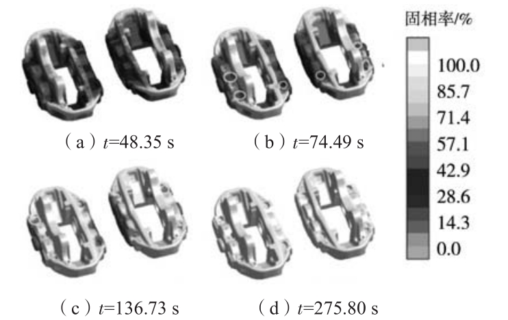 表1 A356鋁合金的熱物性參數 1.3 原始工藝數值模擬結果分析 圖2是制動鉗鑄件在原始工藝下凝固過程中的固相率變化,模擬結果表明,鑄件整體上有呈順序凝固的趨勢,即從鉗體頂端和兩側薄壁處先凝固,并逐漸向兩側活塞孔所在厚壁處凝固。但由于活塞孔兩側部位較為厚大,傳熱困難,容易出現孤立液相區,在凝固時間為74.49 s和136.73 s時分別出現如圖中圈出部位所示的孤立液相區,由于是采用一模兩件工藝,故圖中的孤立液相區呈對稱分布。在金屬型重力鑄造的鑄件凝固過程中,孤立液相區無法通過重力作用和冒口進行補縮,隨著凝固過程體積的收縮將會出現縮松縮孔缺陷。