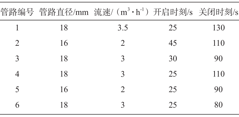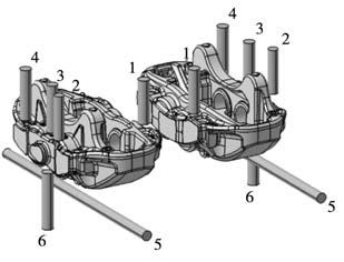 圖2 鑄件凝固過程中的固相率變化 2優化分析 2.1 冷卻優化 通過對原始工藝方案數值模擬結果凝固過程中固相率的分析,鑄件在凝固過程中出現了孤立液相區,不能實現順序凝固,因此需要對鉗體兩側活塞孔所在厚壁處的孤立液相區強化冷卻,加快該部位的凝固速度從而改善凝固溫度梯度,使其能夠順序凝固。圖3是強化的冷卻系統,冷卻管路的直徑和流量根據縮松縮孔缺陷的體積大小進行設置,各管路的開閉時間結合凝固過程中的溫度和固相率變化確定,初始冷卻水溫度為25 ℃,表2是具體的初始冷卻方案參數。在實際生產中,模具的水冷卻系統是通過內外部管道連接形成閉合回路結構,其中冷卻系統設備的控制采用單獨的水路控制閥和流量控制閥,使每個冷卻水通道的冷卻水流速可以通過調節閥和流量計精確地調節和顯示,從而實現冷卻水的流速大小和開關閉時刻的控制。冷卻水溫度則可通過比例閥調節混合冷水與冷卻回水,以達到要求的溫度。