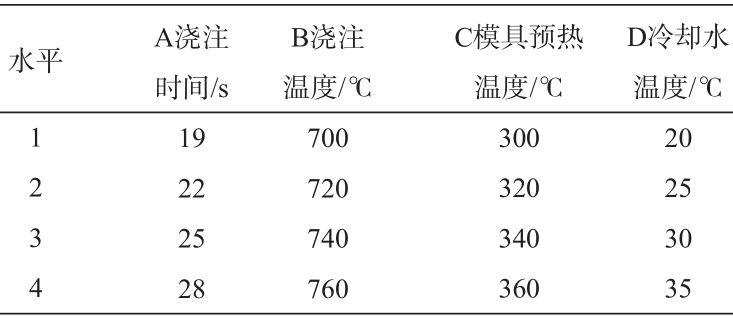 圖3 冷卻系統 2.2 基于正交試驗的工藝參數優化 在原始工藝方案基礎上添加冷卻措施后,利用正交試驗設計進行工藝參數的多目標優化。根據經驗,澆注時間、澆注溫度、模具預熱溫度和冷卻水溫度是金屬型重力鑄造工藝的重要參數,對鑄件成形質量有顯著影響,因此選取上述4個因素作為優化參數,并對每個因素在合適范圍內設置4個水平,得到如表3所示的正交試驗因素水平表,采用正交表L16(44)進行試驗方案設計。