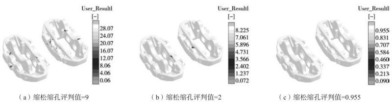 表3 正交試驗的因素和水平 本文以縮松縮孔缺陷和二次枝晶間距作為對鑄件質量的評價指標??s松縮孔缺陷是制動鉗鑄件主要的內部缺陷,其直接影響鑄件的力學性能和疲勞壽命。本文縮松縮孔缺陷的評判值是在考慮局部溫度梯度和冷卻速度的基礎上,引入局部凝固時間的適用于預測鋁合金鑄件中的縮松縮孔缺陷的判據式: