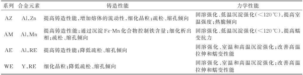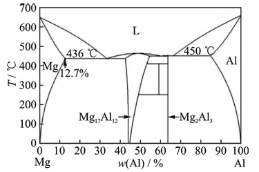圖4 鎂合金對汽車零部件的減重效果 3 低壓鑄造鎂合金材料 純鎂強度較差,因此通常對純鎂進行合金化得到鎂合金。其中的合金元素通過析出硬化、細晶強化和固溶強化直接強化合金的力學性能,表1中簡要介紹了最常見的合金元素及其對鎂合金的影響。鑄造鎂合金按主合金元素不同主要可分為Mg Al系、Mg-Zn系和Mg-RE系等。目前,應用最廣泛的低壓鑄造鎂合金為Mg-Al-Zn(AZ)系。 3.1 Mg-Al系 Mg?Al系是應用最早的鎂合金材料,Al是鎂合金提高鑄造性能和力學性能的最有利元素。從 Mg?Al二元相圖(如圖5所示)可見,Al在α?Mg基體中的固溶度隨溫度變化較明顯,其極限固溶度為 12.7%(質量分數,436 ℃),在室溫下的固溶度約為 2%(質量分數)。隨著鎂合金中Al元素含量的提高,合金的結晶范圍變窄,合金流動性提高,熱裂傾向改善,縮松等缺陷減少,力學性能也得到明顯提高,當合金的Al添加量超過6%(質量分數)時,還可對其進行熱處理強化。在Mg-Al系合金的基礎上添加Zn,Mn等合金化元素(如表2所示),可以進一步提高鎂合金的鑄造性能、力學性能、高溫性能和耐腐蝕性能等,在工業生產中得到廣泛應用。 Mg-Al-Zn(AZ)系合金中 Zn的極限固溶度為 6%(質量分數),Zn主要起固溶強化作用,經熱處理后可得到固溶體組織,提高合金的屈服強度和抗蠕變性能,但Zn質量分數過高時對合金耐腐蝕性能不利,因此一般控制鎂合金中的Zn添加量在2%(質量分數)以下。在眾多AZ系合金中,AZ91D在低壓鑄造上應用最為廣泛,該合金具有優異的成形性和較高的力學性能,可適用于多種成形工藝制造形狀 復雜的結構件。然而該系合金中會形成低熔點脆性相β-Mg17 Al12 ,隨著合金載荷的增加,β-Mg17 Al12 相 和β-Mg17 Al12 /α-Mg相界面上容易形成微裂紋,這些微裂紋逐漸連接形成主裂紋,直至合金斷裂失效,如圖6所示;此外,β-Mg17 Al12 相在高溫下易軟化和粗化,導致高溫強度低、高溫蠕變性能較差,在晶界上富集會降低合金蠕變抗力,使合金只能在125 ℃ 以下工況中應用,限制了該系合金的發展。近 年來,眾研究者為了提高合金的綜合性能,嘗試在 AZ91合金中添加微合金化元素,其中添加微量稀土元素對合金性能的改最為顯著。Wang等研究了添加不同量Gd對AZ91鑄態合金性能的影響,結果表明添加微量Gd可以提高AZ91合金的強度和塑性,且α-Mg晶粒和Mg17 Al12 相均得到顯著細化,因為合金中形成了彌散分布的球形Al8 Mn4 Gd相,起到第二相強化效果;此外,該相可以作為α-Mg晶粒和 Mg17 Al12 相的異質形核質點,同時起到晶粒和組織細化的效果,提高了合金的力學性能。Boby等在 AZ91合金中添加了Sn和Y,發現添加Sn形成了新的Mg2 Sn相,抑制了不連續相Mg17 Al12 的形核和生長;同時加Y和Sn時,出現新的Al2 Y相,Mg17 Al12 體 積分數減小,晶粒尺寸得到細化,合金室溫和高溫拉伸性能、耐腐蝕性能均得到改善,最優Sn和Y的添 加量分別是0.5%和0.9%(質量分數)。Cai等研 究發現添加Ce,Y和Gd可以細化Mg17 Al12 晶粒尺寸,優化其分布,降低合金中Mg17 Al12 相的含量,從而提高合金力學性能和耐腐蝕性,其中Ce的影響最顯著,其次是Y和Gd。截至目前,在AZ91鎂合金中添加Ce,Nd,Y,Ca,Ti,B,Sr,Sb和Bi等微合金化元素均已被廣泛研究,其中對提高力學性能效果最好的是Ce,Nd,Y,Bi和Sb。