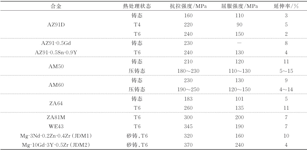 圖8 Mg-Y系合金時效析出強化模型 Mg-Gd系鑄造鎂合金中添加Zn,Y和Nd等合金元素形成三元或多元合金,力學性能更高,抗拉強度甚至可以超過350 MPa。在Mg-Gd系添加Zn 元素時,合金的時效析出序列會發生變化,當合金中 Gd的質量分數在6%以下時,析出序列為:SSSS→ γ??(hcp-Mg70 Gd15 Zn15 )→ γ?(hcp-MgGdZn)→ γ(hcp Mg12 GdZn)。γ?相在 α-Mg基面上形成,可以提高合金的峰時效硬度。而在Gd含量較高的合金中添加Zn時,析出強化來源于在基體棱柱面析出的β? 相與基面析出的γ?相的復合作用,合金力學性能進一步提升。Rong等在Mg-15Gd-0.4Zr合金中添 加1%Zn(質量分數)后,峰時效態合金的屈服強度從232 MPa提高至288 MPa,抗拉強度從296 MPa 提高至403 MPa,這是因為γ?和β?相在基體中相對垂直分布,對基體產生了復合強化作用,其組織形貌如圖9所示。此外,上海交通大學在Mg-Gd合金基礎上開發出高強耐熱鑄造 Mg-10Gd-3Y-0.5Zr (GW103K,JDM2)合金,在低壓鑄造或重力鑄造時有較好的流動性和抗熱裂性,合金經固溶和時效處理后,合金室溫力學性能大大提高,屈服強度高達 240 MPa,延伸率為6%,在300 ℃高溫下屈服強度仍能保持很高水平,對航空航天、軍工等領域輕量化作出極大貢獻,已被應用于輕型導彈殼體及雷達部 件等制備。 Gd 元素在α-Mg中的極限固溶度高于Y,從 548 ℃降溫至200 ℃時,其固溶度從23.5%降至4% (質量分數),因此對Mg-Gd合金進行時效處理,基體可析出大量納米相,帶來顯著的時效硬化效果。Mg-Gd的時效析出序列與Mg-Y系完全相同,峰時效態下主要是β?與β??或β?與β1 兩相共存狀態,合金具有較強的室溫屈服強度。 輕稀土元素Nd在α-Mg中的極限固溶度約為 3.6%(質量分數),也可使鎂合金產生較強的析出強化效果。Mg-Nd 系合金的時效析出序列為:SSSS→β??(DO19-Mg3 Nd)→β?(fcc-Mg3 Nd)→β(bct Mg12 Nd),β??為合金峰時效態下的主要強化相,該相與鎂基體完全共格,二者位向關系為:(0001)β?? // (0001)Mg ,β?? //Mg 。β??相的熱穩定性較高,可以提高Mg-Nd合金的高溫穩定性和耐熱性。然而,Nd元素在Mg中的生長限制因子Q值較小,對鎂合金起不到明顯的細化效果,因此Mg-Nd 合金的鑄態晶粒通常較粗大,無法作為結構材料進行服役,通常需要額外添加Zr或Zn等元素以細化晶粒、改善鑄造性能。上海交通大學在高強耐熱 ZM6合金基礎上調整了Nd/Zn比,開發出性能優良且成本低的Mg-3Nd-0.2Zn-0.4Zr(JDM1)鎂稀土合金,該合金兼具較好的鑄造性能和力學性能,已被應用于汽車輪轂、發動機支架等零部件上。 上述常見的幾類鑄造鎂合金系列及其性能特點整理在表3和表4中。在實際生產中,需要根據鑄件的使用工況來選取合適的合金材料。現有的合金系列均存在一些性能和應用瓶頸,因此優化合金成分, 開發新型合金已成為鑄造鎂合金的重要研究方向 之一。