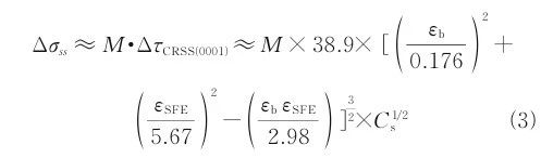 表5 常見二元鎂合金生長限制因子Q的數值 由表5可知,添加Zr,Ca和Si等Q值較高的溶質元素可以有效細化鎂合金晶粒。Fe元素雖然Q 值最高,但對鎂合金耐腐蝕性能有著不利影響,因此一般不考慮以Fe作為鎂合金的合金元素。Zr元素的Q值僅次于Fe,其晶體結構為密排六方晶格,將 Zr添加于不含Al和Mn的鎂合金(如Mg-RE,Mg Zn-RE等)中可顯著細化晶粒;而Zr和Al,Mn, Si,Fe等元素極易發生反應形成穩定的金屬間化合物,這些化合物通常在凝固后期形成,不能作為形核核心細化組織;Zr的額外消耗導致其細化效果進一步降低,雙重作用限制了Zr在含Al和Mn等鎂合金中的應用。Ca元素的Q值也較高,且Ca與Al會 反應原位生成Al2 Ca,與Mg的晶格匹配度較高,可以成為鎂基體的有效異質形核核心,在Mg-Al系合金中作為晶粒細化劑有很大的應用潛力,近些年也得到廣泛研究。除表5中所列元素外,Wang等在AZ31鎂合金中添加0.01%Ti(質量分數)后,晶粒尺寸顯著降低;經過計算得到Ti的Q值為59500,比 Mg-Zr體系中的生長限制因子高4個數量級,表明 Ti作為溶質元素其極高的成分過冷能力導致了 AZ31合金的高效晶粒細化。 還有一些元素會和鎂合金熔體中其他溶質元素發生反應形成穩定的金屬間化合物,這些顆粒有些可作為凝固過程中的形核核心,有些則會偏聚于晶界阻礙晶粒長大,最終起到晶粒細化效果,如添加 Mn和RE元素等。Mn是為數不多的能與Mg發生包晶反應的元素之一,因此雖然Mn的Q值很低, 但仍被作為鎂合金的細化元素被廣泛研究,但Mn 通常在熔體過熱處理后才能起到精煉作用,向AZ91 合金中添加少量Mn,在過熱反應后可以顯著細化晶粒。向鑄造鎂合金中添加一些稀土元素,往往也能起到明顯的晶粒細化效果。Wang等在Mg-Al 體系中添加La,Pr和Ce后,鑄錠晶粒顯著細化,這主要歸因于固-液界面前沿RE元素偏析對晶粒生長的限制,這一假設基于在鑄造鎂合金晶界上觀察到的含RE的金屬間化合物。Chia等也支持這一觀點,他們在Mg中加入La,Ce和Nd,得到了相似的晶粒細化結果。 除加入合金元素外,在低壓鑄造鎂合金熔體中加入作為晶粒細化劑的固體顆粒或原位生成顆粒, 可以增加凝固過程中形核晶粒的數量以起到晶粒細化的效果。對于Mg-Al合金而言,加C是一種有效的晶粒細化方法,在工業上已有成熟應用,但人們對其晶粒細化機理還不清楚。該方法僅在添加鋁(通常Al含量大于2%)的鎂合金中有效,且Be,Zr,Ti 和稀土元素的存在對晶粒細化有不良影響。在Mg Al合金中添加SiC顆粒可以降低晶粒尺寸,但其機 理尚不明確。一些研究者認為,當SiC加入熔體中 時,形成了Al4 C3 ,并起到形核劑的作用;另一些研究者則認為Al2 MgC2 起形核劑的作用;還有人認為Mg 顆粒直接在SiC顆粒上形核。Liu等研究發現在 Al-Ti-C 中間合金中,TiC顆粒總是依附在Al4 C3 顆 粒周圍,形成Al4 C3 +TiC顆粒團,試驗表明該顆粒團對純鎂有顯著的細化作用。除上述之外,Al-Ti-B 細化劑,NbB2 ,ZrB2 ,Mg24 Y5 ,TiB2 等顆粒及稀土等在 含鋁低壓鑄造鎂合金里也展現出良好的晶粒細化效果,但晶粒細化效果還有待進一步提高。 近年來也報道了適用于含鋁和不含鋁鎂合金低壓鑄造的快速凝固技術、超聲波晶粒細化技術和高強熔體剪切晶粒細化技術。快速凝固技術可以使鑄件在凝固過程中的冷卻速度加快,從而抑制晶粒的長大,鑄件的冷卻速度越快,晶體的生長時間越短, 晶粒的尺寸就會變得更小,因此,低壓鑄造快速凝固技術可以有效細化鑄件的晶粒結構。高強熔體剪切晶粒細化技術通過在熔體中產生大量的MgO作為 形核劑而有效地細化晶粒。 綜上所述,盡管研究工作已經進行了幾十年,但仍然沒有一種經濟可靠的晶粒細化技術可用于工業生產。因此,有必要進行更多的研究工作,如進一步了解鐵、錳等雜質對含鋁鎂合金晶粒細化的影響,研究不同方法的晶粒細化效率與鎂合金純度的關系等,尋找鎂合金微觀組織細化的新方法,以擴大鎂及其合金的應用。 4.2 固溶強化 固溶是合金元素在鎂合金中的重要存在形式,溶質原子固溶于Mg基體中,會引起系統能量的升高,同時增加滑移變形的阻力,最終導致基體強度增加,起到固溶強化效果。鎂合金的固溶強化效果由尺寸錯配度εb 、化學錯配度εSFE 及溶質原子濃度Cs 決定,其中εSFE 根據廣義堆垛層錯能(Stacking Fault Energy)的變化計算。由于密排六方(hcp)金屬下的主要滑移方式為基面滑移,根據第一性原理近似表示鎂合金的固溶強化效果Δσss :