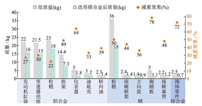 圖3 電磁泵低壓鑄造工藝原理圖 此外,吳國華等結合涂層轉移制芯技術、坩堝液體金屬密封技術與低壓鑄造技術,創新性開發出大型鎂合金鑄件精密低壓鑄造成型新工藝,保證了鎂合金液的高純度和高凈度。所制造的鎂合金鑄件組織致密、尺寸精度高、表面質量好,且已具備100 kg鎂合金鑄件研發與小批量試制能力。 2 鎂合金低壓鑄造的發展現狀 早在20世紀初,英國就提出了低壓鑄造技術, 并將該技術應用在鎂合金生產上,但受限于當時技術和設備,一直未得到大規模應用。第二次世界大戰后,汽車工業開始快速發展,對汽車輪轂等零部件的需求量不斷增加,而這類零部件也適合用低壓鑄造工藝生產,進而該技術得到迅速發展,但設備和技術僅掌握在少數發達國家手中。20世紀中葉后,各 國開始投入人力物力對低壓鑄造技術的原理和工藝進行了深入研究,隨全球化進程和科技發展,低壓鑄造的設備也在不斷升級,其應用范圍更加廣泛,現已大量應用于航空航天、汽車及各類機械產業中。 以低壓鑄造鋁合金輪轂為例,其在20世紀80年 代的市場占有率僅為4%,但到了21世紀初其市場占有率便擴大至60%以上。目前低壓鑄造已成為生產鋁合金輪轂最主要的工藝。為進一步加速汽車輕量化進程,各國廠家與研究者正加快鎂合金輪轂的研發與生產,以替代鋁合金實現更深入的輕量化,研究主要聚焦于新材料、新工藝上。研究表明, 若要獲得與鋁合金輪轂相同的剛度,鎂合金輪轂的壁厚僅需增至鋁合金輪轂的1.17倍,此時其質量也僅為鋁輪轂的78%,具有明顯輕量化效果;在新能源車上用鎂合金輪轂代替鋁合金輪轂,車輛續航能力可以提高8%以上,汽車加速性能和減振效果也得到明顯提升。目前用于鎂合金的鑄造工藝有重力鑄造、高壓鑄造、擠壓鑄造以及低壓鑄造等。其中,低壓鑄造因其充型平穩和順序凝固等特點在鎂合金零件制造上有獨特的優勢,在工業領域受到廣泛的關注。但通過低壓鑄造技術生產鎂合金輪轂仍有待深入研究和改進,技術還不成熟,沒有得到廣泛推廣和應用。 進入21世紀以來,隨著計算機技術的發展,數值模擬技術被廣泛地用于低壓鑄造工藝的開發和優化。利用軟件對鎂合金的鑄造過程進行數值模擬, 可以提前預測出鑄件中產生的氣孔、疏松及夾渣等缺陷的出現位置及原因,縮短產品工藝開發的周期, 減少試模次數,降低生產成本。李靜怡等采用 鑄造模擬軟件EasyCast和NovaCast對鎂合金隔板鑄件低壓鑄造工藝過程進行數值模擬,發現隔板鑄件凝固過程未遵循順序凝固原則并有縮孔產生,通過添加冷鐵進行工藝改進,有效加強補縮效果,改善了縮孔缺陷。張華等基于AnyCasting鑄造模擬軟件分析了AZ91D鎂合金輪轂的鑄造過程,精確定位鑄造缺陷的部位并找出缺陷產生的原因,進而對鑄造工藝進行了優化,減少了試模次數,從而大大降低了成本;數值模擬的結果也為鎂合金輪轂的低壓鑄造提供了理論指導與依據,促進了低壓鑄造鎂合金輪轂的工藝開發和生產進程。 近年來,新能源汽車快速發展,為汽車工業輕量化提出了更高的要求。《中國制造2025》提出了汽車發展的整體規劃,輕量化已經成為世界各國汽車廠商最新核心的發展目標之一,圖4為鎂合金對汽車零部件的減重效果。純電動汽車重量每降低10%,續航里程便可增加約6%,而車輛的電池包系統重量占整車20%以上,成本占整車高達30%~ 60%,在動力電池系統中,電池殼占系統總重量約 2%~30%,是主要的結構件,因此在保證電池系統功能安全和車輛整體安全的前提下,電池殼的輕量化已經成為電池系統主要改進目標之一。《鋁鎂合金鑄件行業市場現狀研究報告》指出,當前鎂合金鑄件具備替換鋁合金鑄件在汽車輕量化領域應用的三大條件,即:鎂合金的密度約為鋁合金的2/3,且比強度高于鋁合金及鋼材,使用鎂合金替代鋁合金可實現25%~35%的減重率;鎂鋁價格比回落至1.3 區間內,“鎂代鋁”經濟上更具性價比;鎂合金在抗振、散熱、強度等方面具備優勢。2022年國內單車鎂合金用量僅3~5 kg,對比鋁合金單車100 kg以上的用量,發展潛力巨大。智己L7車型全套電驅動系統殼體是鎂合金材料在新能源電驅動殼體上的首次量產應用,這也是目前在國內外汽車領域量產應用的最大的鎂合金零組件之一。隨后,上汽也開發了多款鎂合金新能源電驅總成產品,并成功量產,加速拓寬了鎂合金新的應用場景,也預示了鎂合金在新能源汽車上的美好應用前景。隨著新能源汽車性能逐步提升,對電驅殼體、電池托盤等部件的輕量化和性能要求也有所提高,對低壓鑄造可熱處理強化鎂合金部件的需求愈發緊迫。