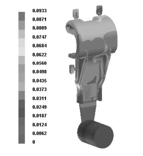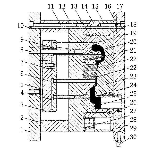圖7 壓塊縮松分布 根據壓塊壓鑄件的結構及模擬分析結果,設計出壓塊壓鑄件的半固態壓鑄模具,見圖8。半固態壓鑄模具在結構上與一般的壓鑄模具相同,在生產前要對模具充分預熱,由于半固態的溫度較低,凝固時間短,因此模具在預熱時要比液態壓鑄高,一般在280~300℃,需在動、定模套板上設計加熱元件和測溫孔,安裝熱電偶測溫,以便控制模具溫度,同時要求模具各個部位溫度均勻穩定。