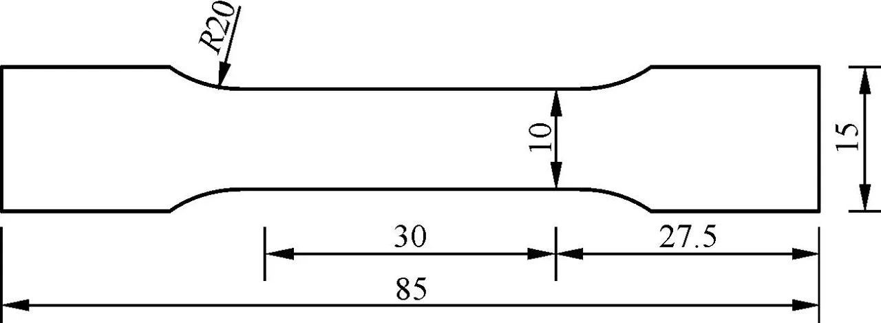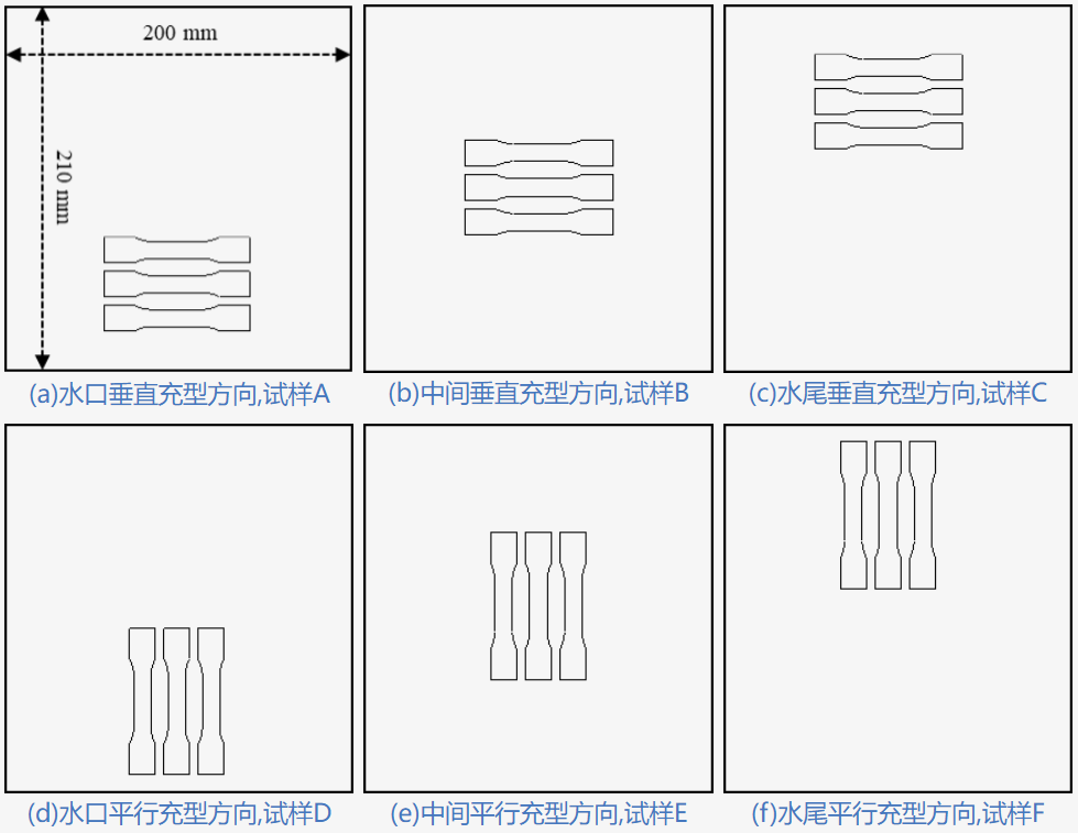 圖2 拉伸試樣尺寸 選用AlSi10MnMg平板,研究取樣方式對(duì)其拉伸力學(xué)性能的影響。試片分為2組:試片A、B、C垂直于平板主充型方向,試片D、E、F平行于平板主充型方向,取樣位置包括水口附近、平板中間以及水尾。圖3為6組不同取樣方式示意圖,其應(yīng)力-應(yīng)變曲線見圖4。圖5為不同取樣方式AlSi10MnMg平板鑄件的平均伸長(zhǎng)率。可以看出,取樣方式對(duì)試樣強(qiáng)度影響并不明顯。伸長(zhǎng)率的變化相較于強(qiáng)度更為顯著。在平行充型方向的中間位置(E組),獲得了最高的伸長(zhǎng)率,達(dá)到9.42%;而在平行充型方向水尾位置(F組),伸長(zhǎng)率則最低,為6.84%。
