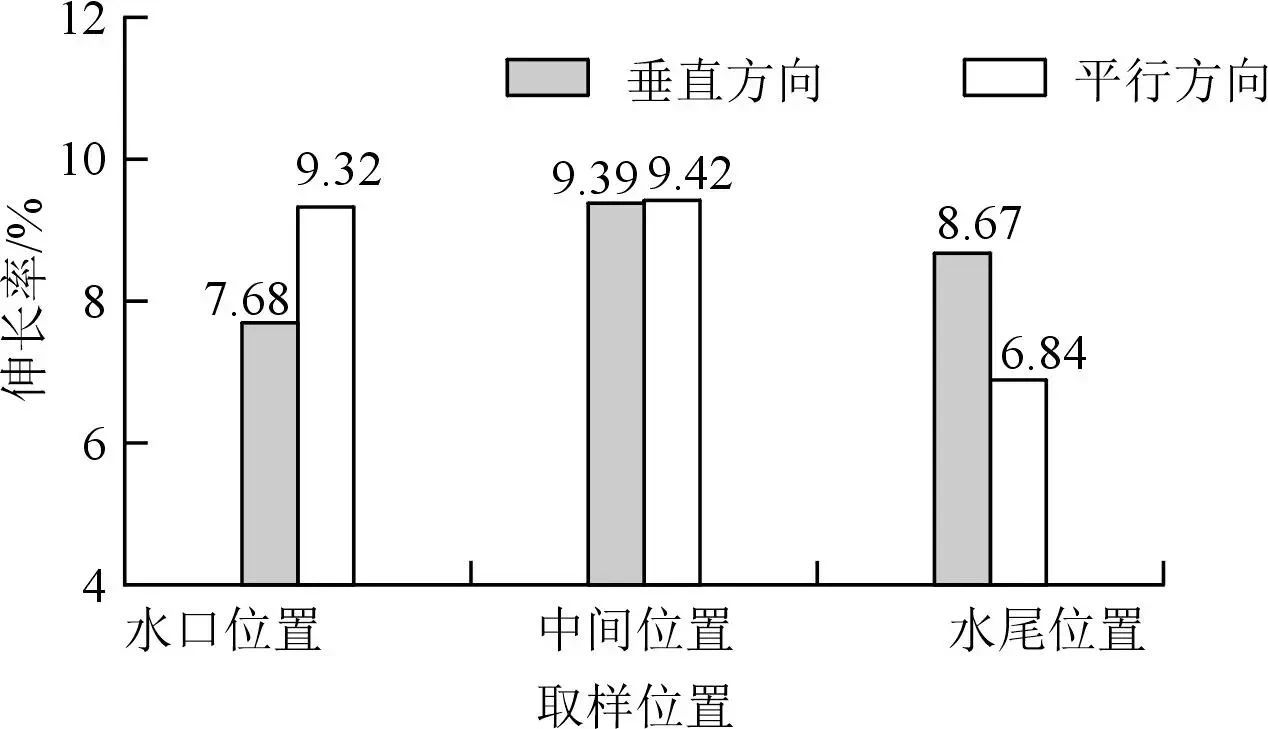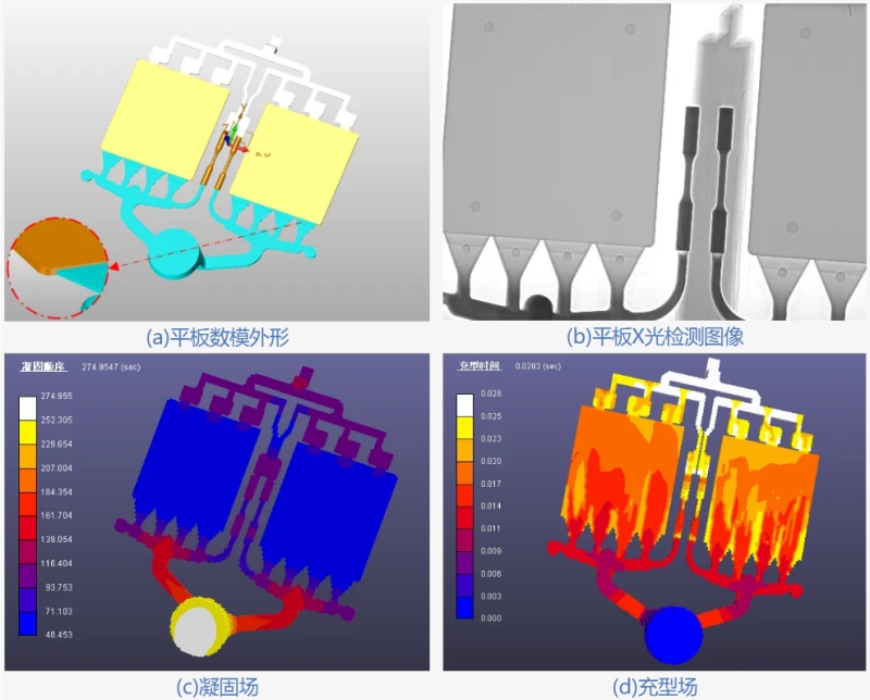 圖5 AlSi10MnMg平板不同位置、方向取樣伸長(zhǎng)率 隨著鋁液在型腔內(nèi)的逐步填充,鋁液溫度會(huì)逐漸降低并凝固。鑄件在水口位置因溫度較高且均勻,在無卷氣、熱節(jié)時(shí),內(nèi)部品質(zhì)通常優(yōu)于其他位置;溫度越低,越易產(chǎn)生縮孔、冷隔等缺陷,內(nèi)部品質(zhì)通常較差,性能更低。然而,從圖5可見,設(shè)計(jì)的平板并不完全遵循這一規(guī)律。伸長(zhǎng)率最佳的位置均出現(xiàn)在平板的中間,而非水口。這一現(xiàn)象與平板設(shè)計(jì)的特定因素緊密相關(guān)。圖6為平板外形、X光檢測(cè)和模流分析。從圖6a可以看出,試驗(yàn)平板的內(nèi)澆口經(jīng)過減薄處理,導(dǎo)致鋁液在進(jìn)入內(nèi)澆口后能以較大的速度向前填充。盡管平板各處的凝固時(shí)間差異不大(見圖6c),鋁液在水口附近的填充順序卻存在先后差異(見圖6d),這使得垂直充型方向的鋁液填充不均勻,從而導(dǎo)致伸長(zhǎng)率相對(duì)較差。在水尾位置,垂直方向的伸長(zhǎng)率反而較高,這表明垂直方向劣于平行方向的規(guī)律并非固定不變。鋁液的凝固過程并不嚴(yán)格遵循順序凝固規(guī)律,在型腔內(nèi)鋁液溫度的不一致性仍會(huì)導(dǎo)致先后凝固差異,對(duì)鑄件內(nèi)部質(zhì)量影響不顯著,見圖6b,但對(duì)力學(xué)性能,尤其是伸長(zhǎng)率的影響頗為明顯。