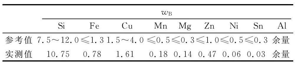 表1 YDC11鋁合金的化學成分(%) 通過對廢鋁合金箱體分析,澆口夾渣主要有3種形態:縮孔類、油污類和冷硬層。其中以油污類的夾渣數量居多,占夾渣總數的60%以上;冷硬層占夾渣總數的35%左右;而縮孔類占夾渣總數的5%。 當敲掉鋁合金箱體澆道料餅后,澆口處出現呈不規則形狀、內部比較干凈、表面粗糙的類似縮孔狀的孔洞,見圖1??s孔類夾渣的鑄件澆口表面凹陷,打磨涂裝后外觀仍不光潔。產生原因是內澆口溫度比較高(實測最高模溫為380℃),是最后凝固的部位,造成該處Al液來不及補縮,產生縮孔缺陷。