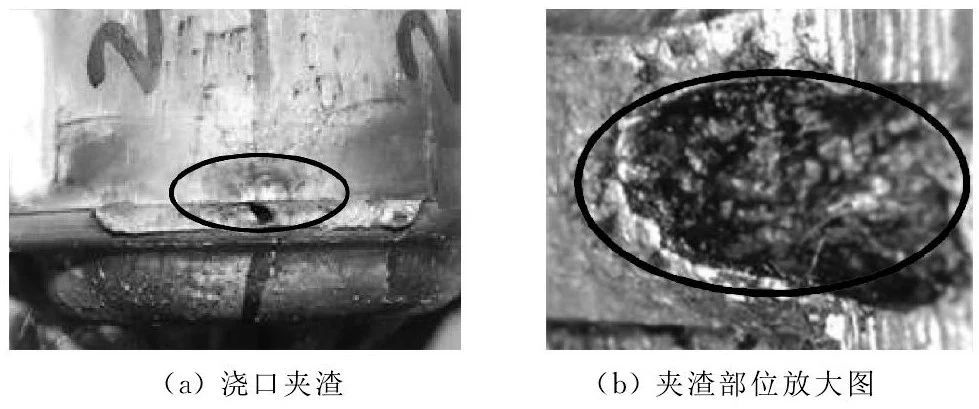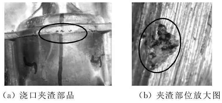 圖1 類似縮孔的澆口夾渣 每一鑄造循環需向沖頭加注潤滑油,沖頭油在Al液澆注后沒有完全燃燒,被包裹在Al液中形成雜質一起填充到型腔。由于包裹有沖頭油的Al液溫度較低,會較早凝固,流動速度慢,因而在填充末了時停留在產品末端。加之內澆口截面積小,流動阻力大,這部分包裹有沖頭油且提前凝固了的Al液雜質更不容易通過,停滯于內澆口附近。敲掉料餅后,在內澆口處呈現黑色孔洞,其內壁粗糙,表面有明顯油污,見圖2。檢查澆口和料餅夾渣情況,同樣發現此類雜質。