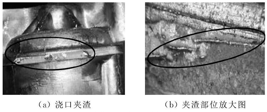 圖2 油污類的澆口夾渣 冷硬層是指被注入到料筒內的Al液與料筒低溫表面接觸急速冷凝所形成的殼體(光譜儀檢查冷硬層化學成分未發現異常,均在標準允許范圍內),在高速填充時隨Al液一起被填充到型腔,見圖3。固態的冷硬層密度(2.7g/cm2)比液態(2.45g/cm2)的Al液大,在沖頭低速運行階段,冷硬層慢慢聚集在Al液的末端。沖頭高速運行時,部分冷硬層將被卷入型腔,形成缺陷。最終殘留在內澆口的冷硬層形態見圖4。冷硬層多為薄片狀,表面有光澤且較硬,與周圍母材多存在間隙,不僅影響外觀,也降低零件的強度。