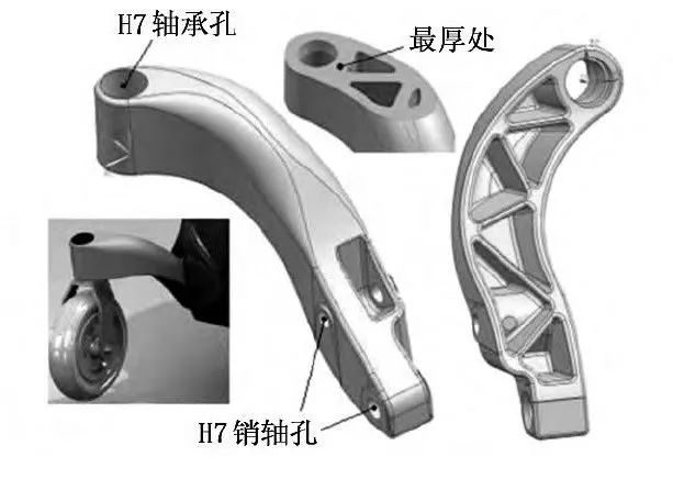 ![]() 原標(biāo)題:廈門恩比爾:消除壓鑄鋁腳輪支架氣孔缺陷的措施 壓鑄件是在壓鑄機(jī)高壓作用下,使液態(tài)金屬以較高的速度充填壓鑄模型腔并在壓力下凝固成形的零件。由于液態(tài)金屬充填速度極快,型腔中氣體很難及時(shí)排出。因此,壓鑄件常有氣孔和氧化夾雜物存在,從而影響了壓鑄件的品質(zhì)。降低壓鑄件的氣孔缺陷(尤其對(duì)于厚壁的壓鑄腳輪支架)是壓鑄生產(chǎn)的一大難點(diǎn)。壓鑄鋁腳輪支架由于其結(jié)構(gòu)具有筋條多、壁較厚且不均勻的特點(diǎn),易產(chǎn)生氣孔、縮松等缺陷。以鋁壓鑄腳輪支架為例,通過分析腳輪支架結(jié)構(gòu),設(shè)計(jì)合理的澆注系統(tǒng)使鑄件利于排氣和補(bǔ)縮,在生產(chǎn)中掌握好鋁液熔煉工藝要點(diǎn),總結(jié)一些有關(guān)厚壁鋁壓鑄件解決氣孔問題的生產(chǎn)經(jīng)驗(yàn)。開始時(shí)采用傳統(tǒng)壓鑄工藝,結(jié)果很不理想,廢品率達(dá)50%。通過對(duì)腳輪支架零件進(jìn)行工藝分析后,改用慢壓射工藝,加厚內(nèi)澆口為4mm,壓射速度為0.4m/s,廢品率降到20%。進(jìn)一步提高合金品質(zhì),改進(jìn)排氣方式,廢品率最終降至1%。 圖文結(jié)果 腳輪支架是電動(dòng)輪椅車底盤上的一個(gè)重要部件,見圖1。材質(zhì)為ADC10,部件前端軸承孔和尾部兩處銷軸孔采用CNC機(jī)加工,孔位預(yù)留加工余量。鑄件加工面不允許存在氣孔、縮松等缺陷,鑄件表面最后做噴粉處理。鋁壓鑄腳輪支架外形尺寸為260mm×220mm,平均壁厚達(dá)到8mm,在充型過程中容易卷氣,形成氣孔類缺陷。毛坯最厚部位在軸承孔靠腳輪支架內(nèi)面邊上(見圖1),厚度達(dá)15mm左右,容易產(chǎn)生縮松缺陷。