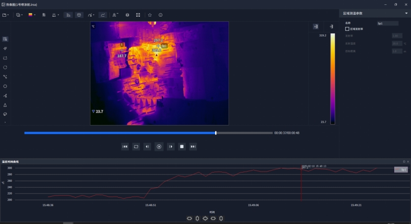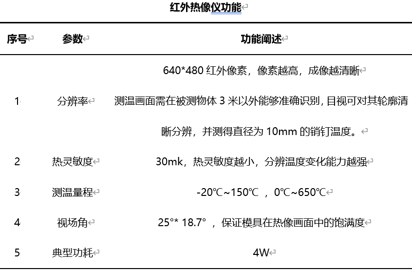 系統由多種關鍵硬件組成,包括安裝在壓鑄現場的在線紅外熱像儀、熱像儀防護罩、電源設備,以及用于現場監控的工控機或PC。其中,在線紅外熱像儀作為核心組件,能夠實時采集模具表面的溫度分布數據,生成高分辨率的熱像圖,為模溫分析提供直觀的參考。熱像儀防護罩為設備提供必要的物理保護,確保其在高溫、高壓、潮濕等復雜工作環境中的穩定運行。電源設備則為系統持續運行提供穩定的能源支持,而工控機或PC作為數據處理與監控中心,負責實時接收、存儲并分析熱像儀采集的溫度數據,協助操作人員動態監測和優化模具溫度控制。通過各硬件的緊密配合,系統能夠在不中斷生產的情況下,實現對模具溫度的實時、精準監測,為壓鑄工藝提供高效、可靠的溫度管理支持。接下來將對各組件進行詳細說明。 系統核心設備為高性能紅外熱像儀,集成了進口處理芯片、法國紅外熱成像芯片以及賽靈思FPGA邏輯芯片,這些高端硬件的組合確保了設備卓越的計算性能與穩定性。紅外熱像儀的分辨率為640×480紅外像素,相較于傳統設備,其像素密度更高,能夠呈現更清晰的溫度分布圖,精確捕捉模具表面的溫度變化,滿足高精度測量需求。設備在3米以外即可準確識別被測物體的溫度分布,確保即使在生產現場復雜環境中,也能保持較高的溫度測量可靠性和成像質量。此外,目視條件下,紅外熱像儀能夠清晰分辨模具輪廓,且精確測量直徑為10mm的銷釘溫度,為精細部件的熱分布分析提供支持。該紅外熱像儀還具有卓越的穩定性,支持7*24小時不間斷運行,即使在高溫、高濕或震動等嚴苛的工業環境下,依然能夠持續提供可靠的溫度數據。這種設計有效避免了傳統測溫設備因間歇性停機或誤差帶來的生產效率下降問題,特別適合高強度的壓鑄生產環境。具體的設備參數如表1所示: