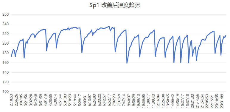 圖7 通過數據分析和模具異常的檢查,發現模具內部冷卻水路接口漏水,導致模具溫度無法及時有效降至合理范圍以內,通過維修處理,得到改善。如圖8、9是改善后數據。