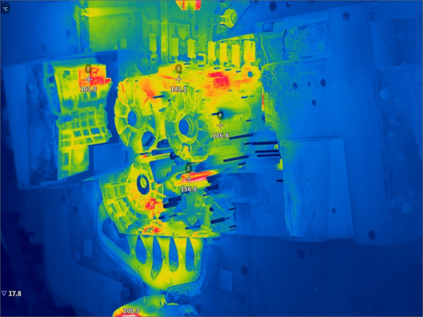 圖4 針對熱成像圖像中反映出的冷卻不均問題,生產團隊對模具冷卻系統進行了整改。通過調整銷釘部位的冷卻通道布局,增加了冷卻液的流量,并重新優化了冷卻液的溫控策略,以確保銷釘區域能夠得到充分的冷卻。整改后,再次使用熱成像儀對同一部位進行監測,結果顯示銷釘區域的溫度降幅符合預期,成功降至了150℃左右。這一變化證明了冷卻系統的調整有效提升了該部位的冷卻效率。 經過整改后的冷卻系統不僅解決了銷釘部位溫度過高的問題,還有效避免了因過高溫度導致的零部件開裂。通過后續的生產驗證,使用熱成像技術監測后的模具冷卻過程更加均勻,零部件的質量得到顯著改善。最終,本次實驗驗證了熱成像技術在發現冷卻系統問題、提升生產質量中的重要作用,并為未來類似問題的解決提供了有效的技術手段。具體實驗結果如圖5所示